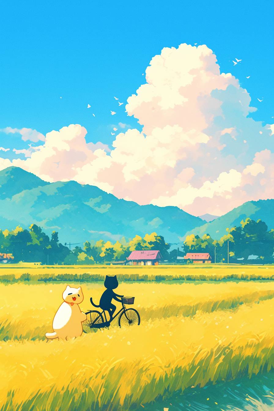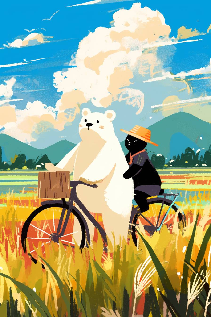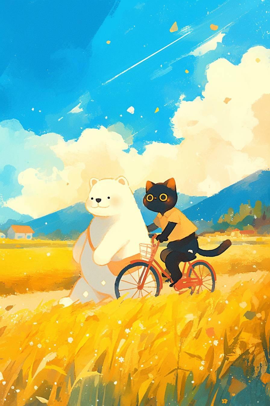 귀여운 검은 고양이와 귀여운 뚱뚱한 흰 곰이 논에서 자전거를 타고 있다. 단순한 선 그림 스타일과 생생한 색깔로 치유의 분위기를 자아낸다.