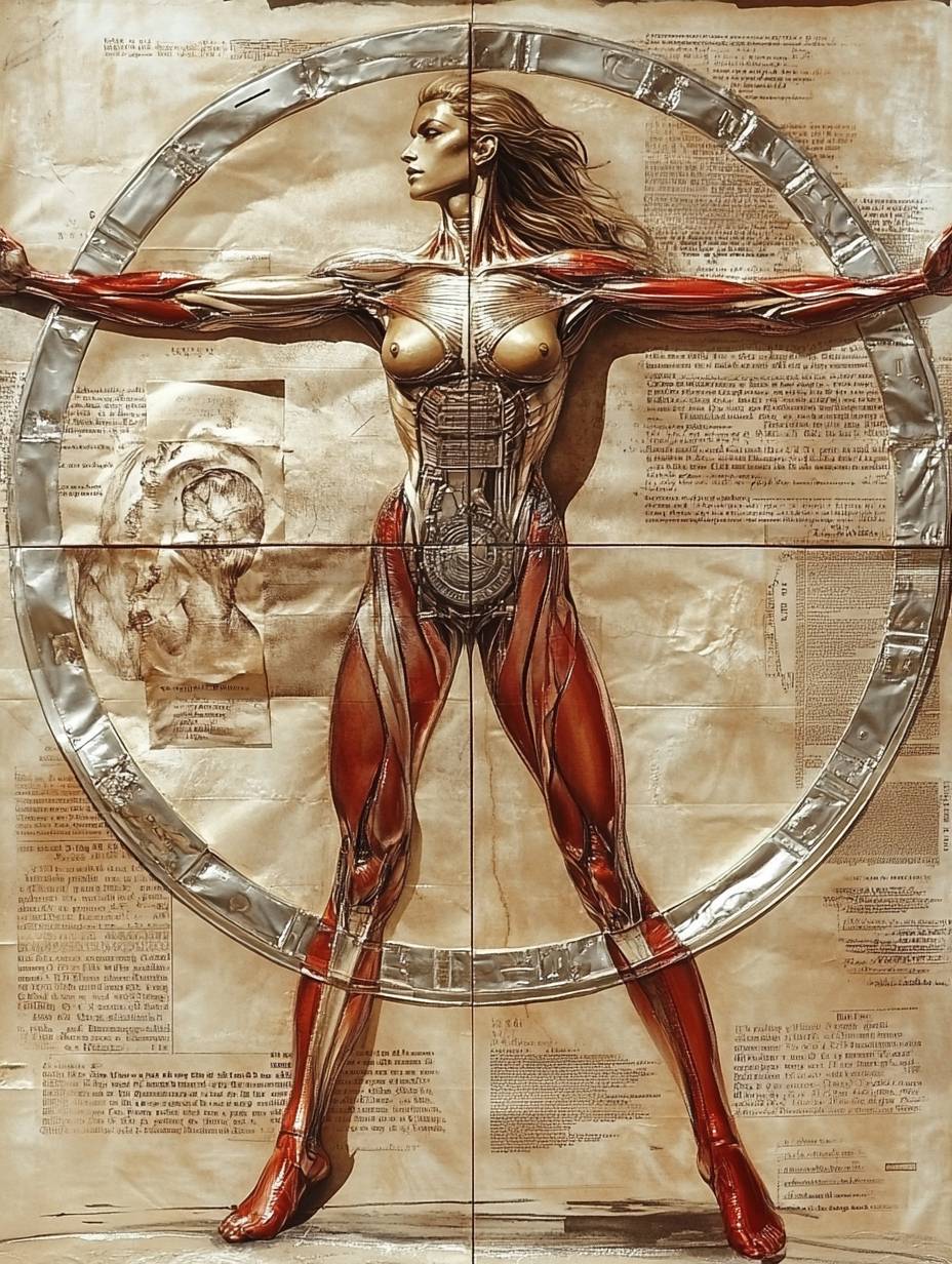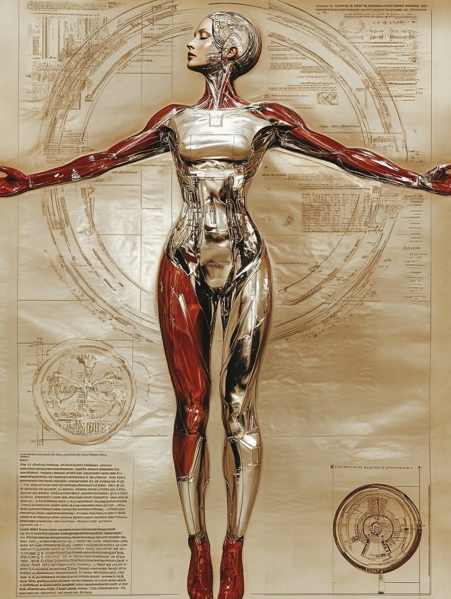 다빈치의 비트루비안처럼 묘사된 아름다운 사이보그 여성. 그녀의 몸에는 네모와 원, 그리고 선들이 그려져 있으나 여성스럽고, 베이지색 종이에 라틴어로 된 비문이 있습니다.