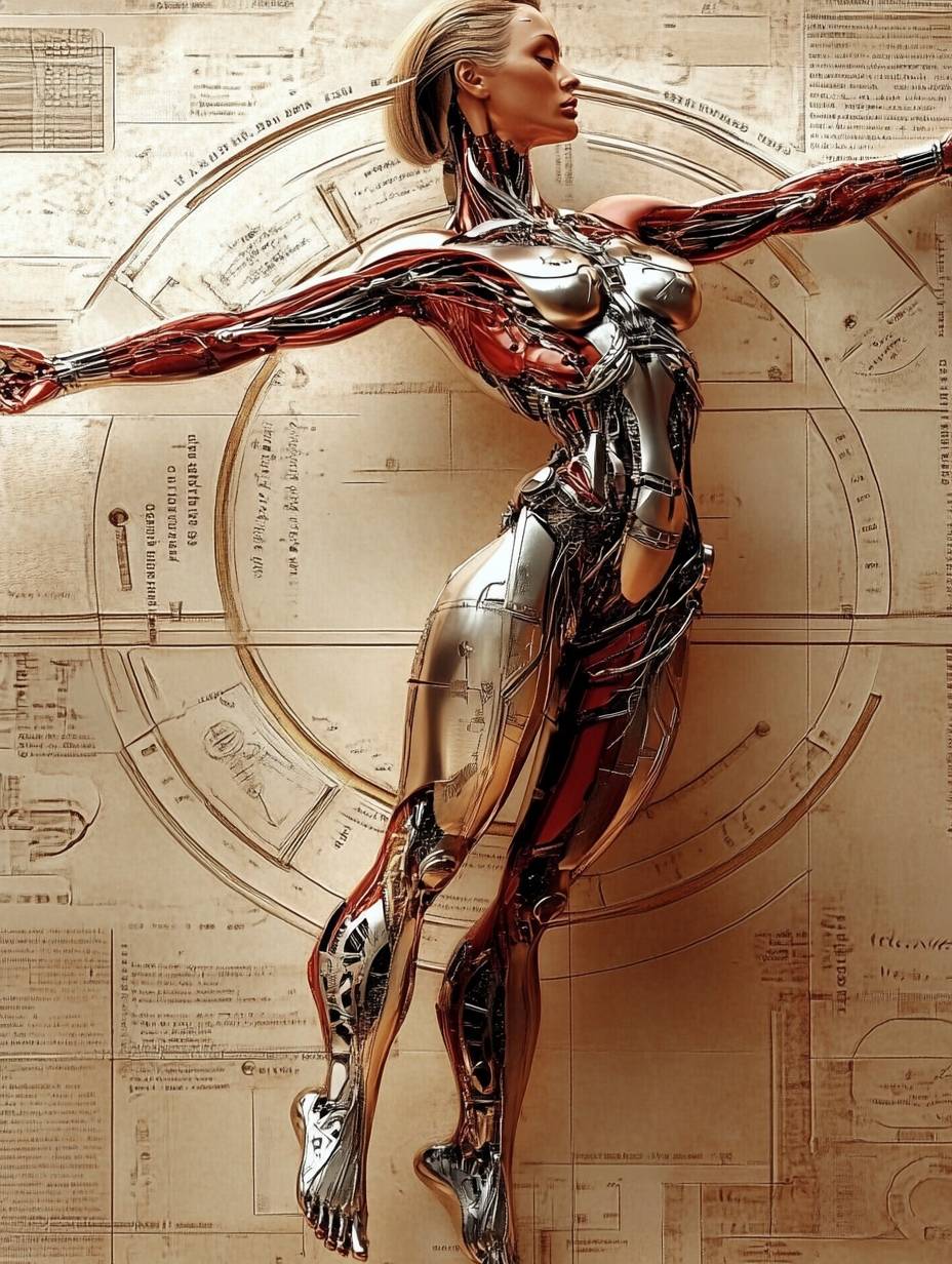 다빈치의 비트루비안 인체도를 참고한 아름다운 사이보그 여성의 모습.
