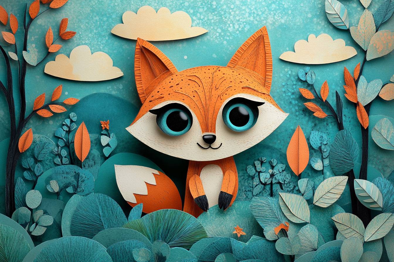작은 여우가 종이 나무와 패턴 하늘 배경 속에서 탐험하고 있으며, 순수함과 신비감을 보여준다.