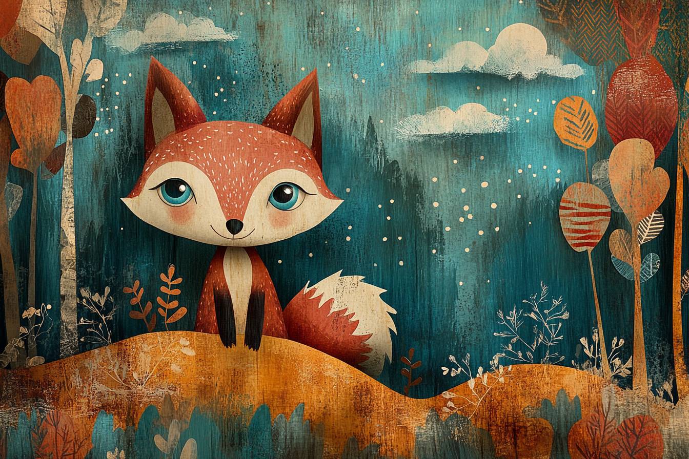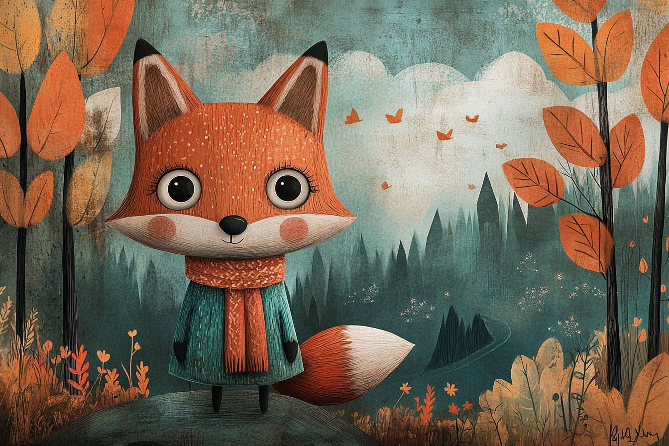 작은 여우가 탐험을 하며, 배경에는 종이로 잘라낸 나무와 패턴이 있는 하늘이 있습니다. 순진한 민속 예술 일러스트 스타일로 표현되었으며, 색상 팔레트는 산호색과 청록색을 사용합니다. 그들의 기발한 의상과 큰 눈은 경이로움과 호기심을 발산하며, 장면 속 순수함과 신비로움의 균형을 만들어냅니다.