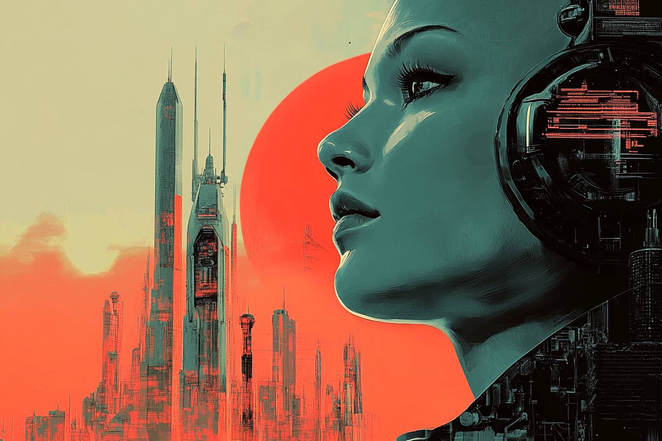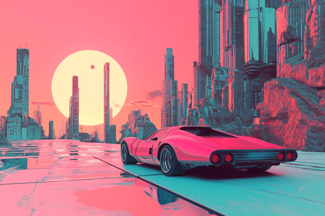 복고 미래주의의 이원성을 나타내며, 20세기 중반의 미학과 미래 요소를 결합합니다. 대비 색상 체계를 사용하여 과거와 미래의 융합을 강조합니다.