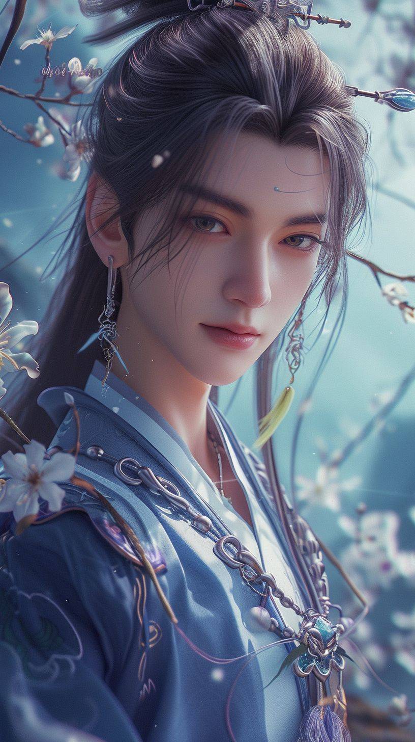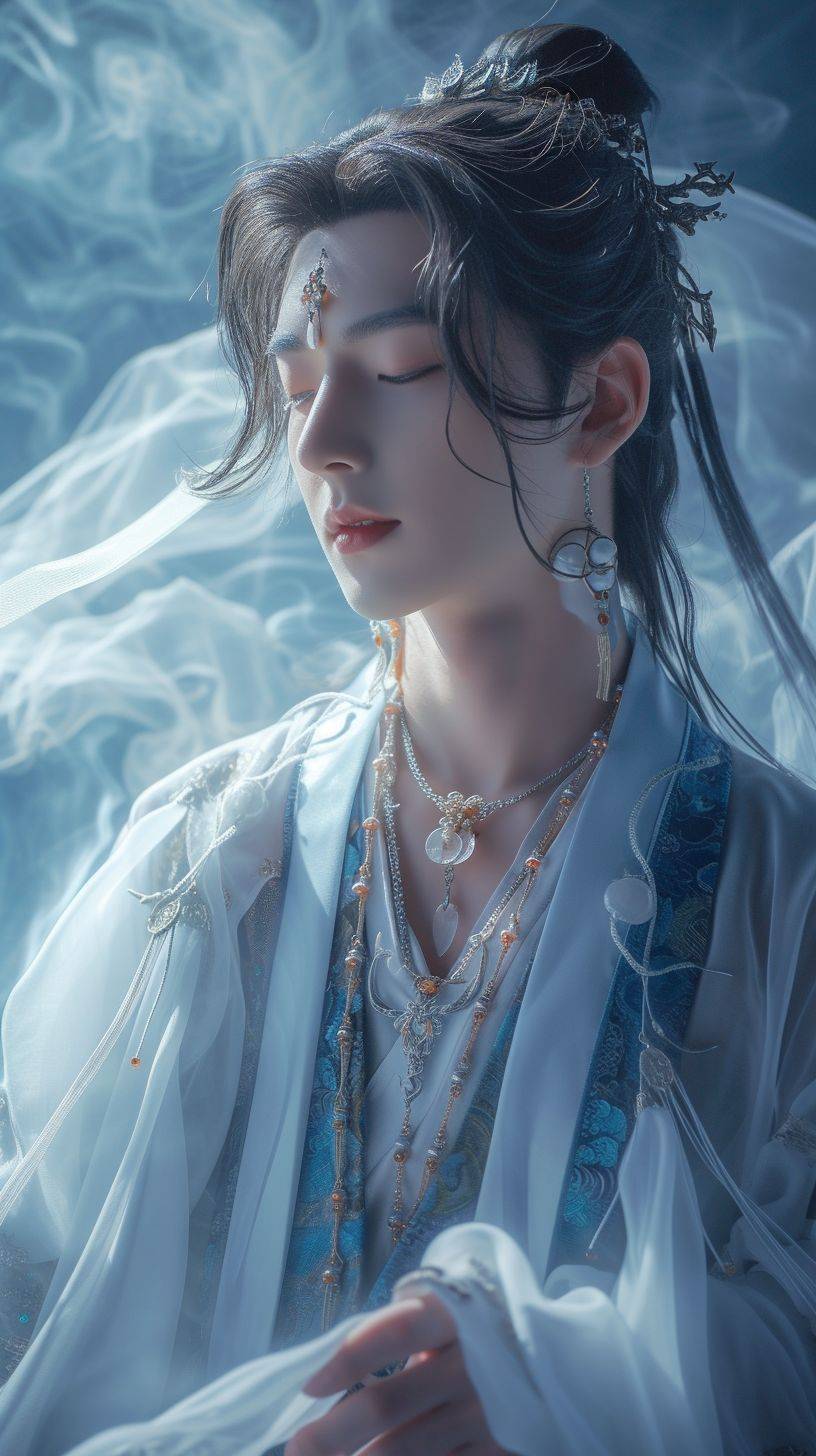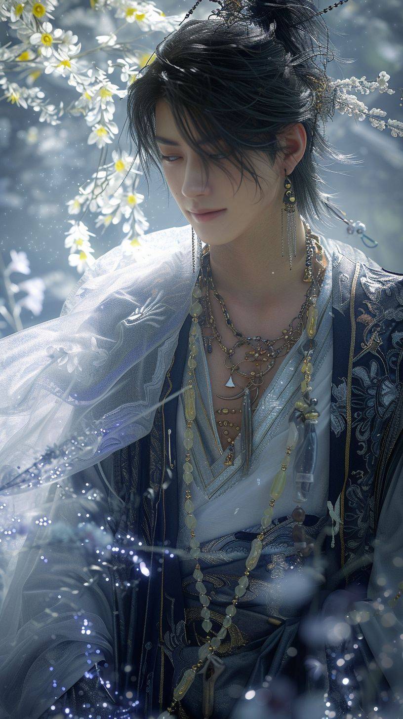 29세의 중국 소년이 목걸이를 착용하고 도교 복장을 입고 있으며, 심사정의 영감을 받아 청색의 스타일을 보여줍니다. 섬세한 머리카락, 봄의 왕자, 앤틱 스타일의 예술 작품, 판타지 미학, 안개, 봄의 신, 8K 고화질/상세 아트, 달콤한 미소, 전신 샷, 봄의 장면, 액션 샷, 슈퍼 리얼리스틱, 8K.