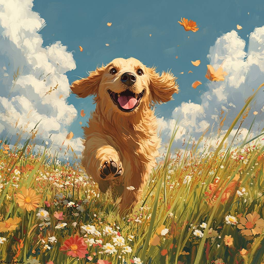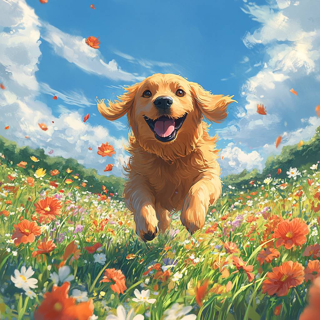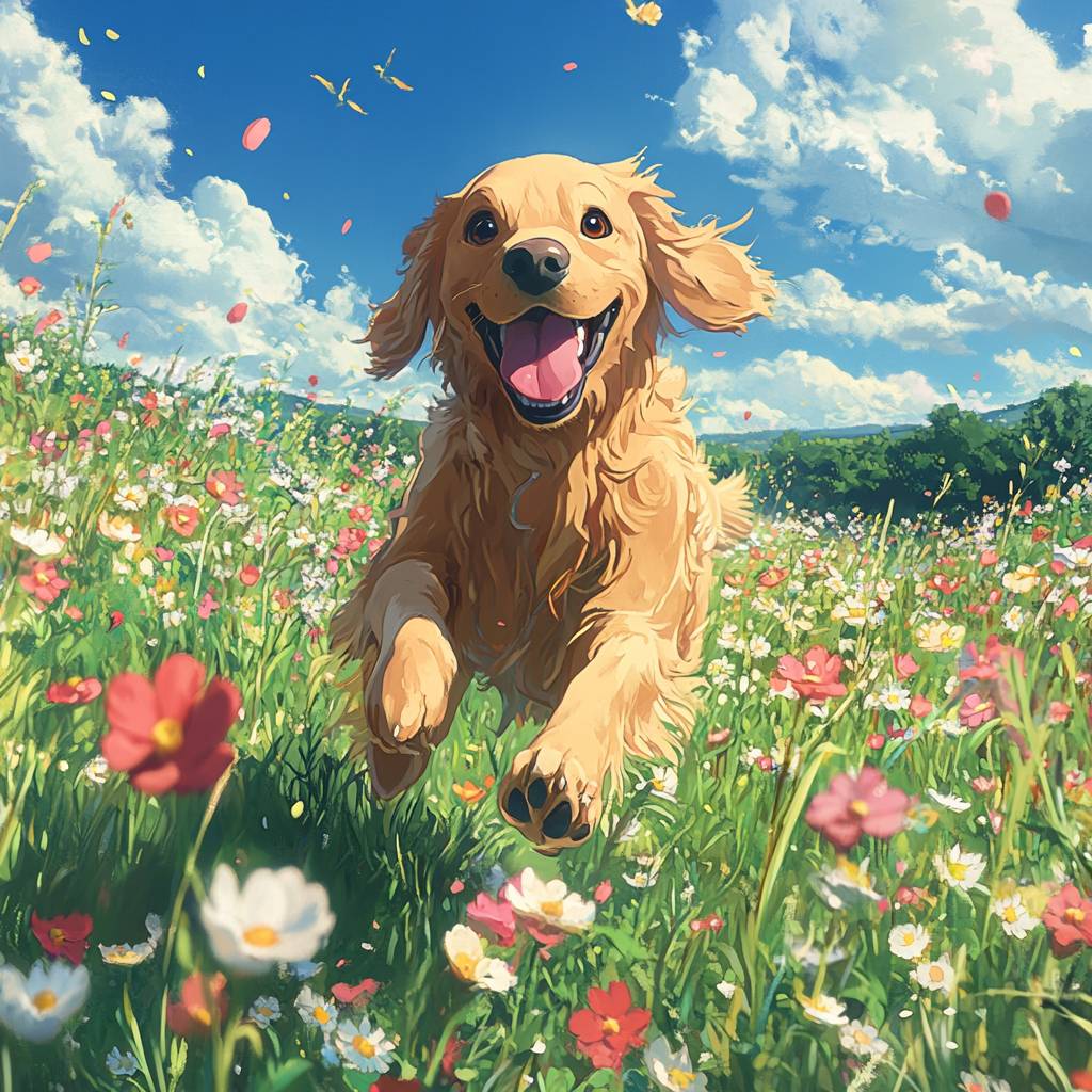 꽃이 가득한 풀밭에서 뛰어노는 골든 리트리버의 지브리 스타일 애니메이션 아트.