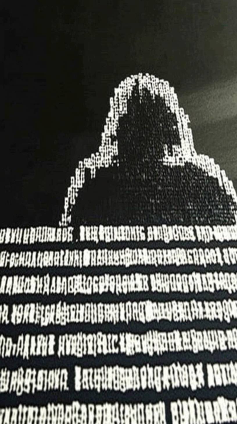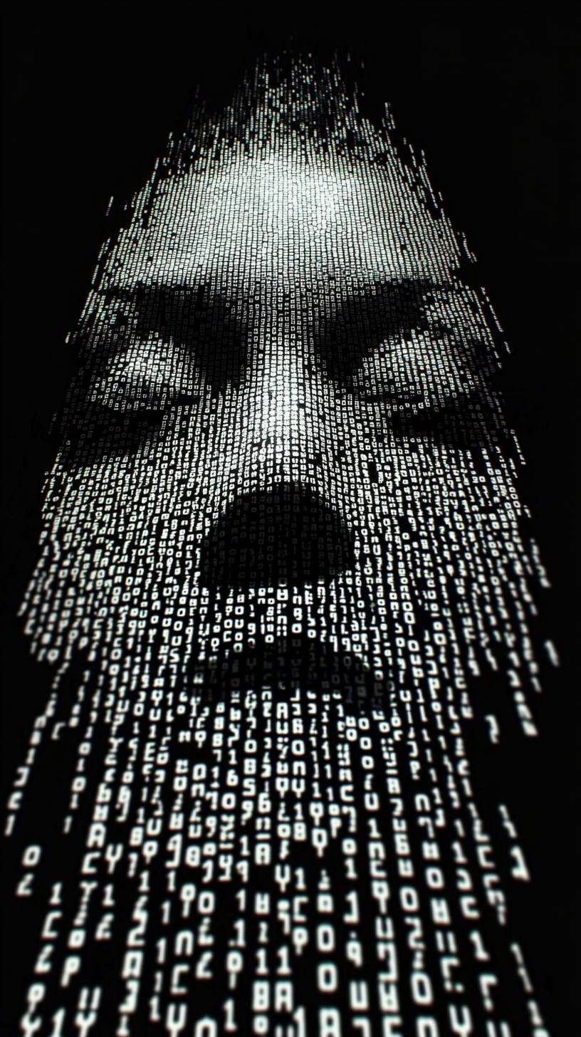 검은 배경에 하얀 ASCII 텍스트로 형성된 컴퓨터 해커 모양.