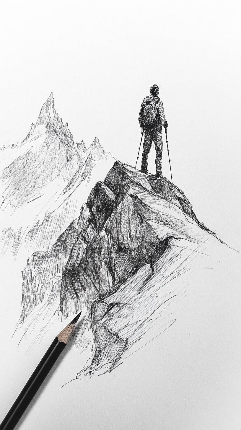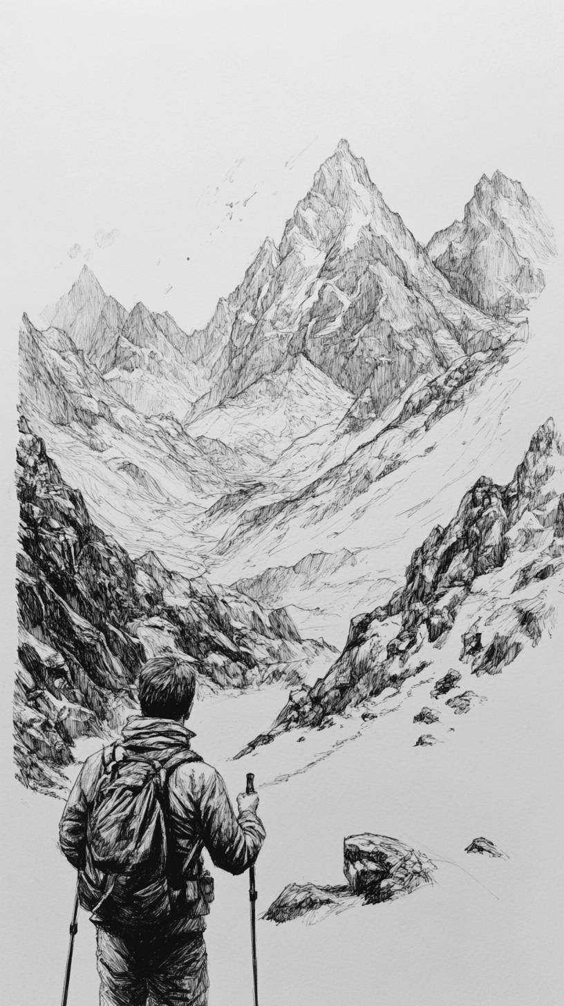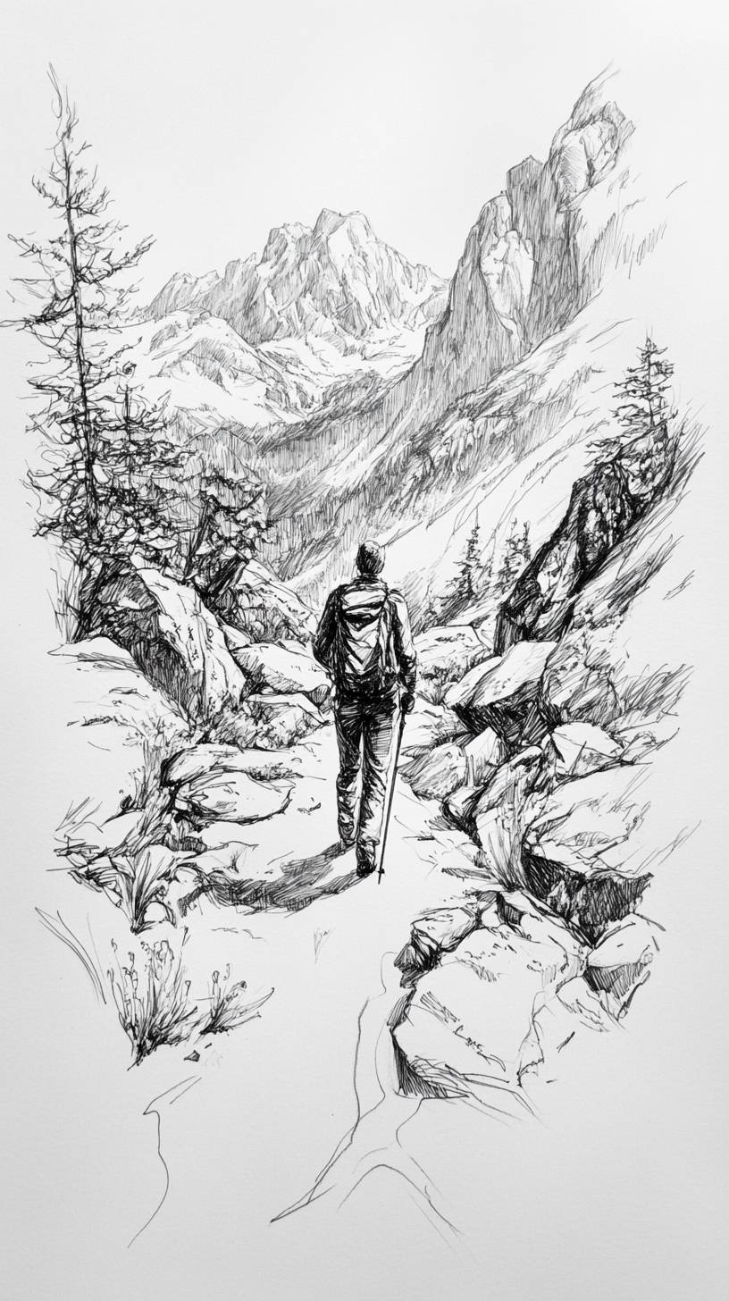 sketch, ink, scratches, hiking in mountains, --ar 9:16 --v 6.1