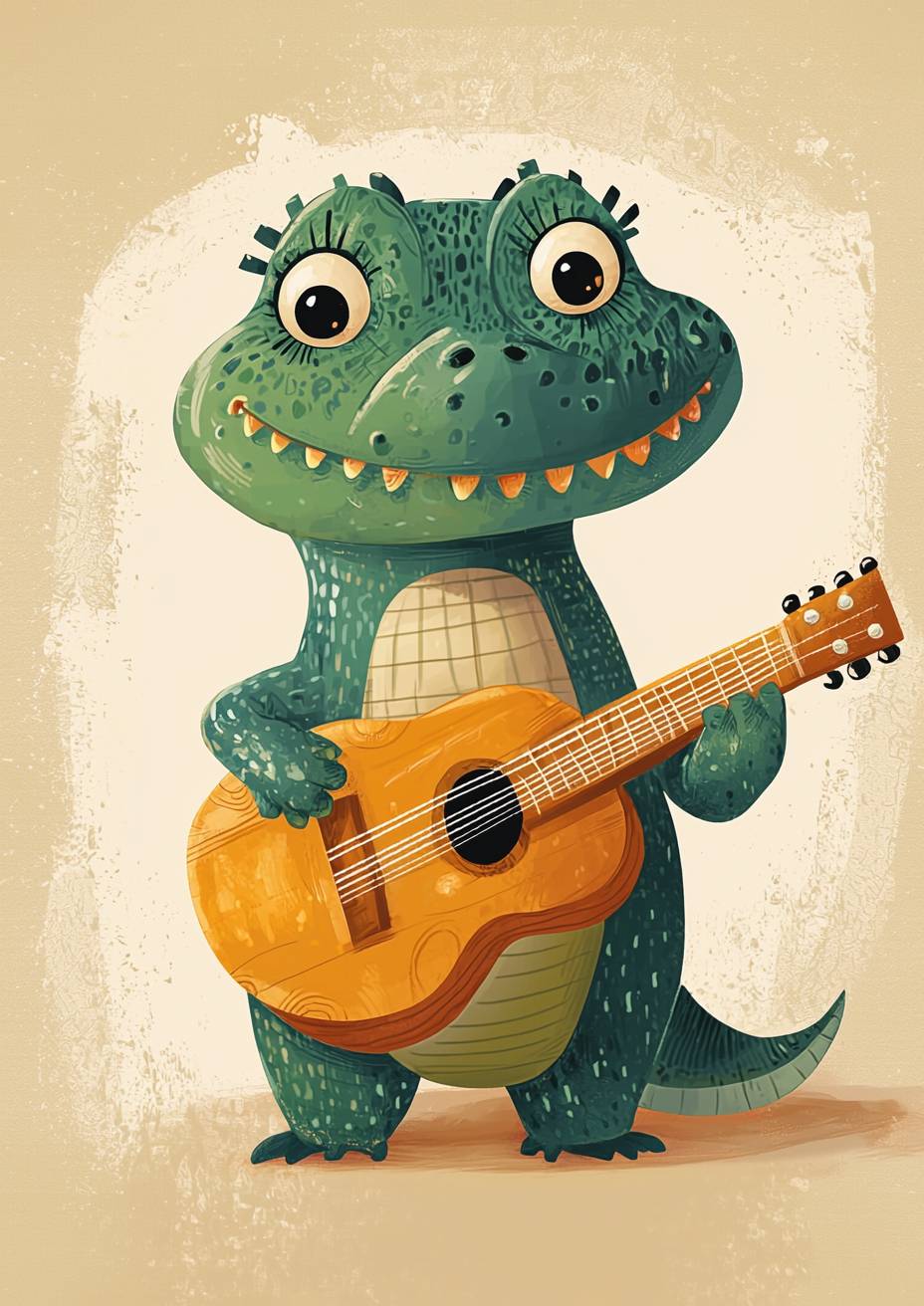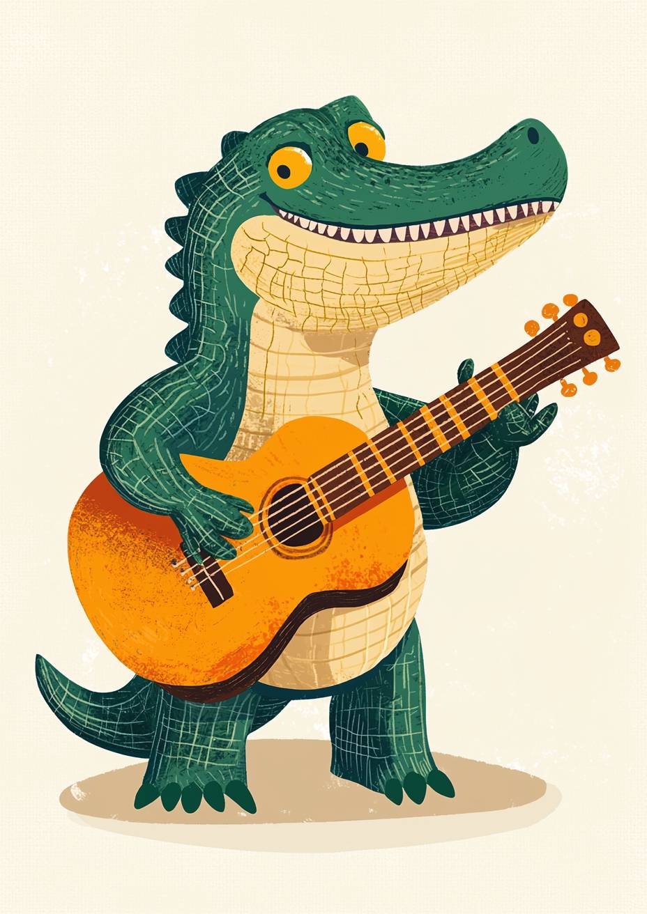 귀여운 악어가 기타를 치고 있으며 색상이 풍부하고 어린이 책 그림을 연상시키는 단순한 스타일입니다.