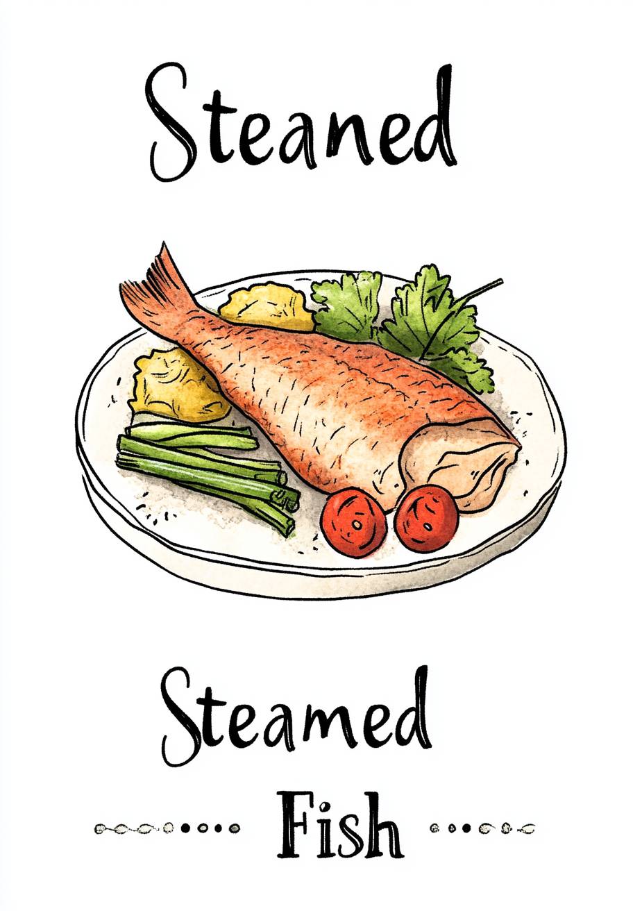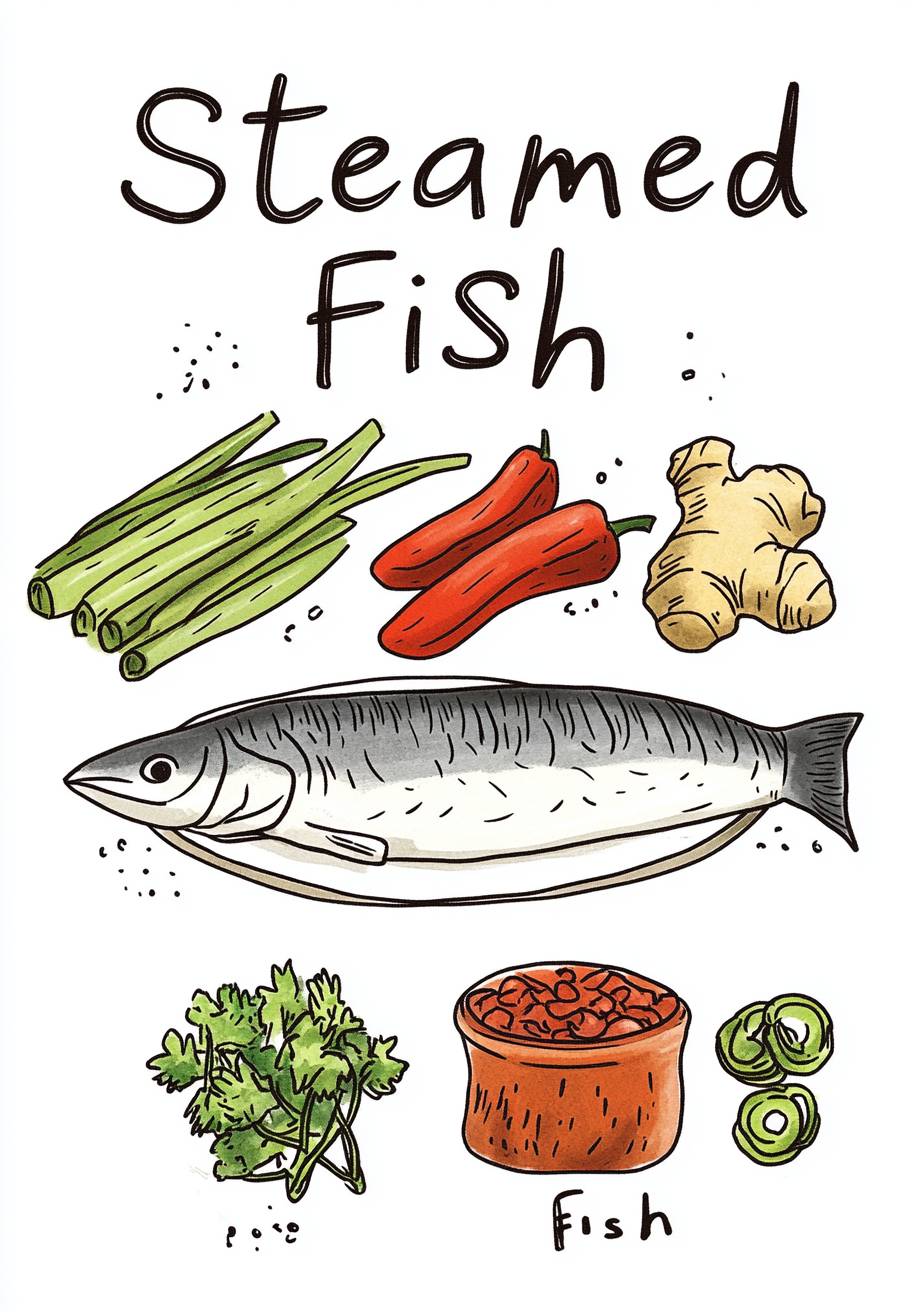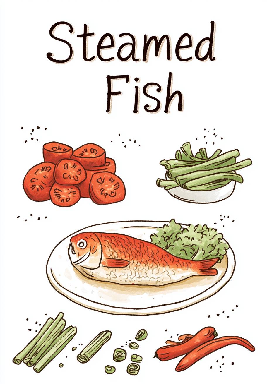 A simple, brightly colored, hand-drawn children's book style illustration page with the words "Steamed Fish" showing the ingredients and fish. Ingredients include red pepper, chopped green onion, ginger, soy sauce. "High definition, white background, with a full plate of steamed fish, the overall style of these images seems similar to Miyazaki's children's drawings. --ar 89:128 --v 6.1