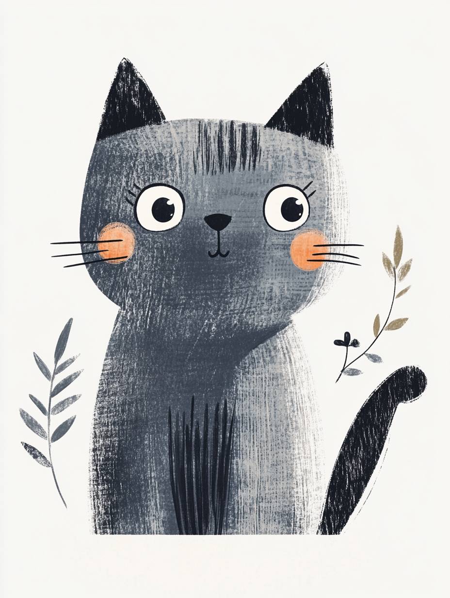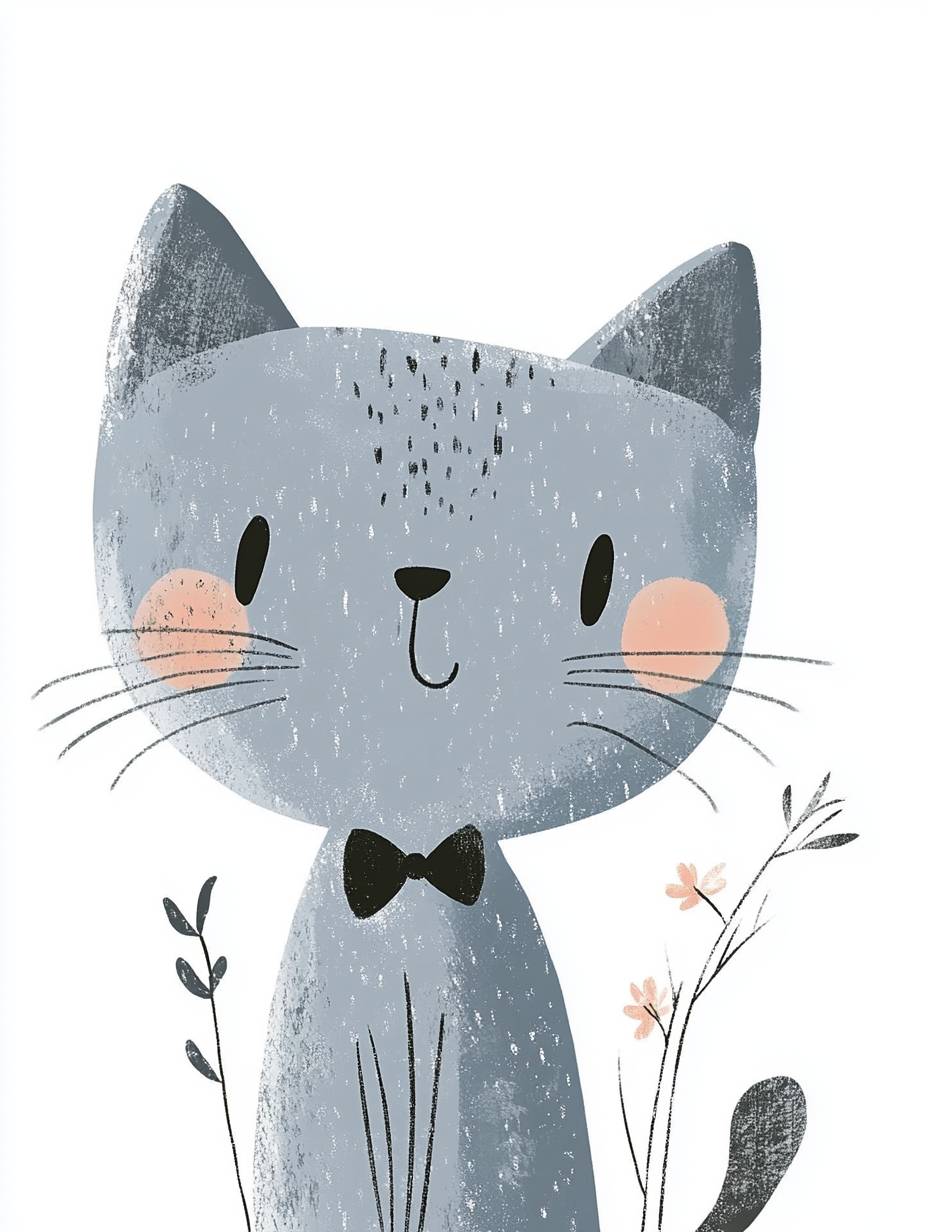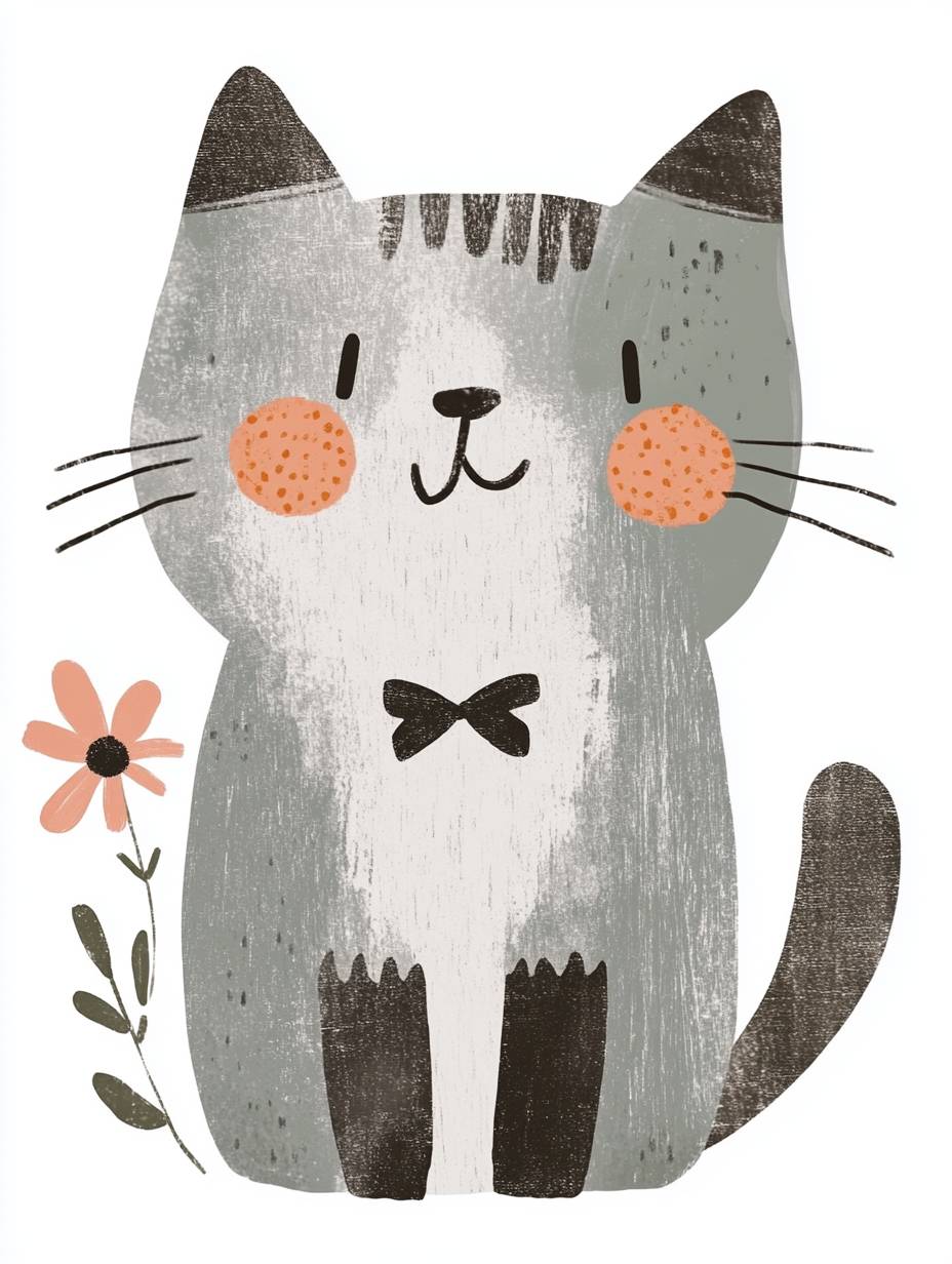 수줍은 표정과 빨개진 볼을 가진 귀여운 회색 아기 고양이의 간단한 평면 그림 스타일 일러스트를 어린이 책을 위해 제안합니다. 이 스타일은 다케마사 료, 존 클래센, 에릭 칼의 영향을 받았습니다. 작품은 아름답고 미니멀한 흰색 배경을 특징으로 합니다. 파스텔 색상과 굵은 검은 윤곽선이 인상적이고 수상 경력이 있는 외관을 제공합니다. 아기 고양이의 눈은 서로 다른 패턴을 가지고 있으며, 꽃이 한쪽 귀 사이에 끼어 있습니다. 아기 고양이는 또한 작은 나비 넥타이를 하고 있습니다.