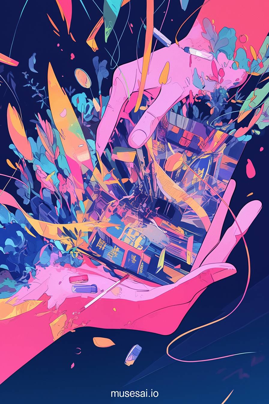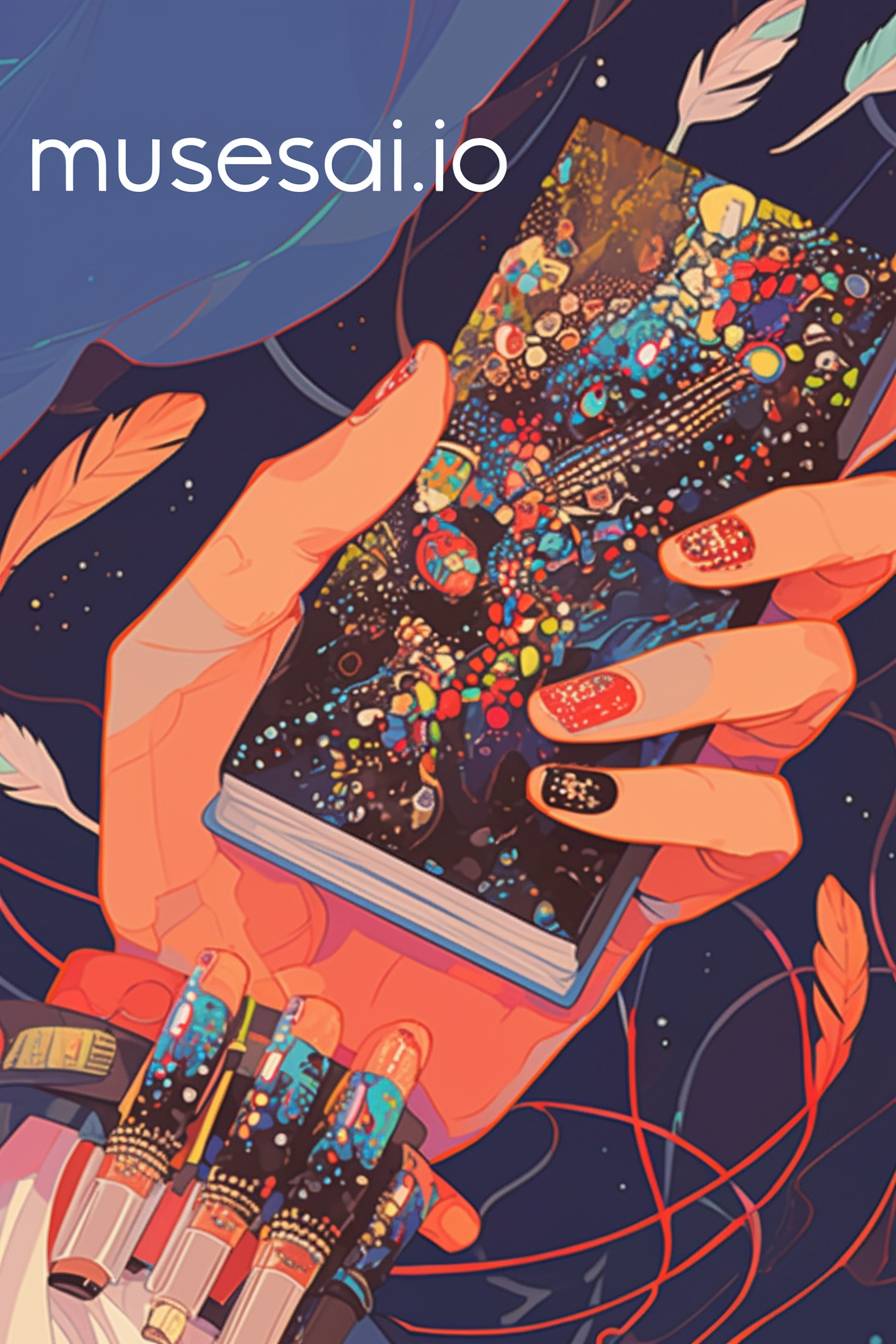 hand holding a book with the title of "musesai.io", handheld, nails, colorful, bright colors, aerial view, minimalist outlines, large-scale, captivating --ar 2:3 --niji 6 --style raw