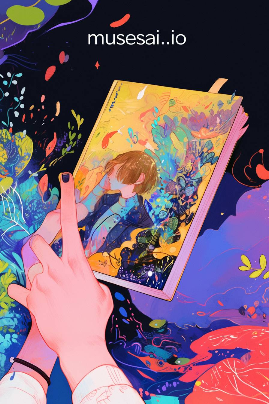 책을 들고 있는 손, 제목은 'musesai.io', 손에 쥐고, 손톱, 다채로운, 밝은 색, 공중에서 본 모습, 미니멀한 윤곽, 대규모, 매력적인