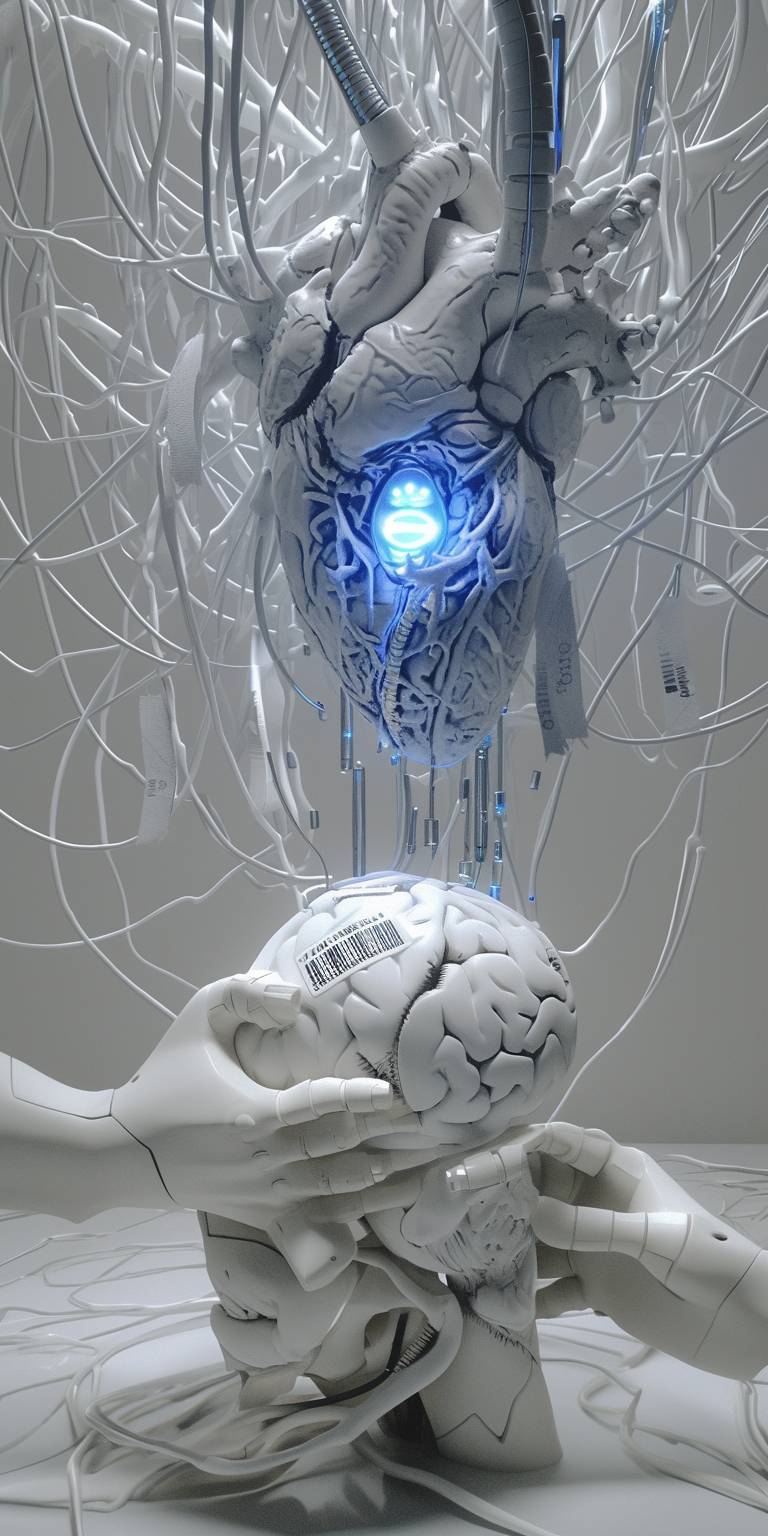 A surreal video, an extreme close-up of a heart surrounded by many miniature lines and LED lights. The brain is made of white porcelain, and blue light emanates from the inside of the heart as if it were glowing. At the top, it has a barcode sticker on one side of its head. In front of it was a metal manipulator with long, thin, white hands with sharp nails. All the backgrounds are light gray. --ar 1:2 --niji 6 --style raw