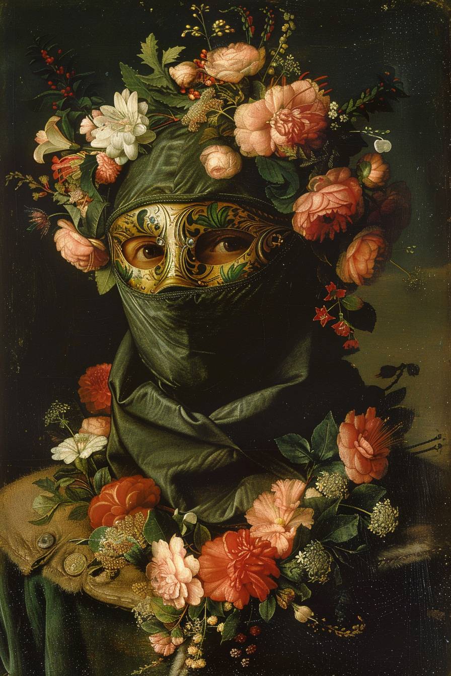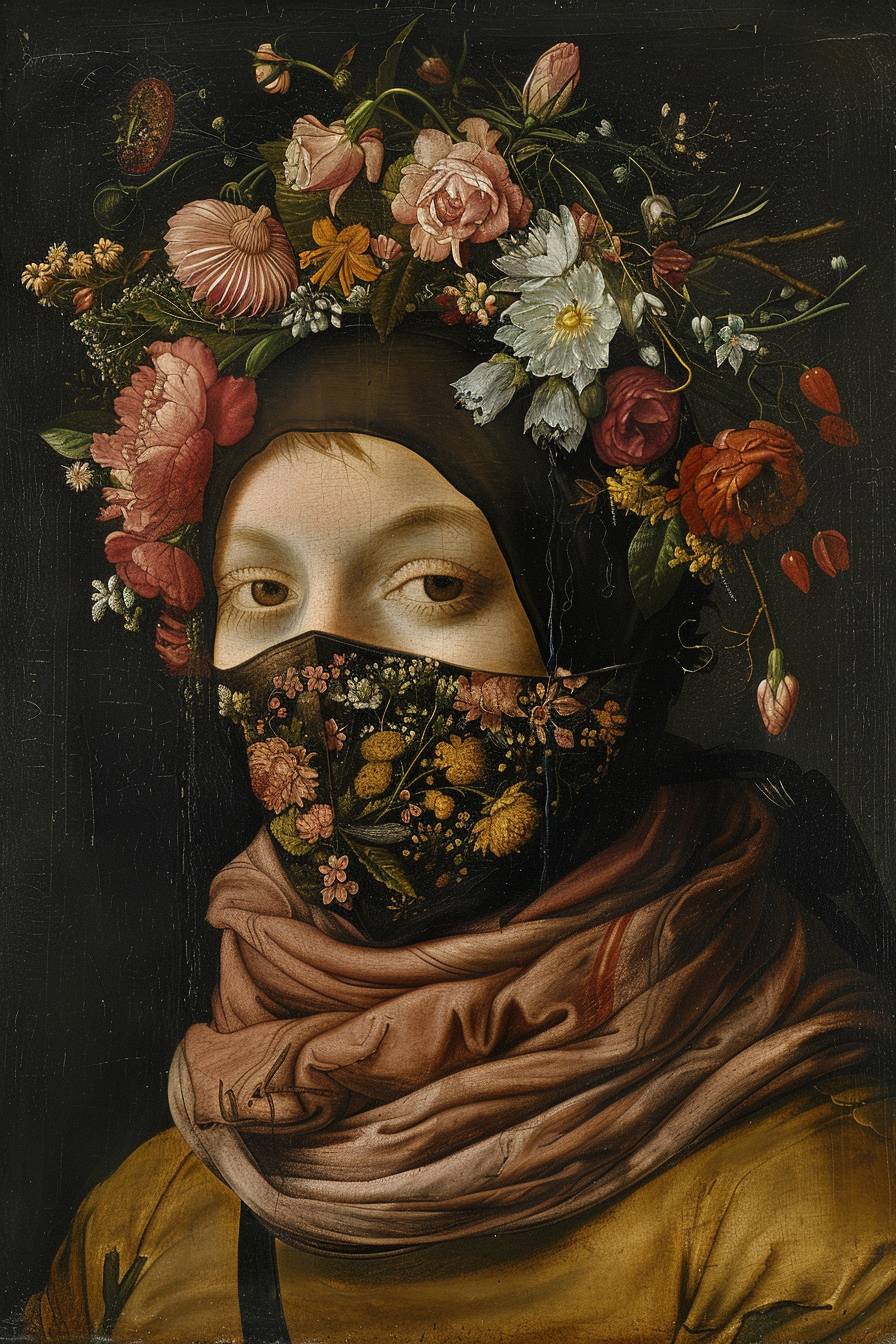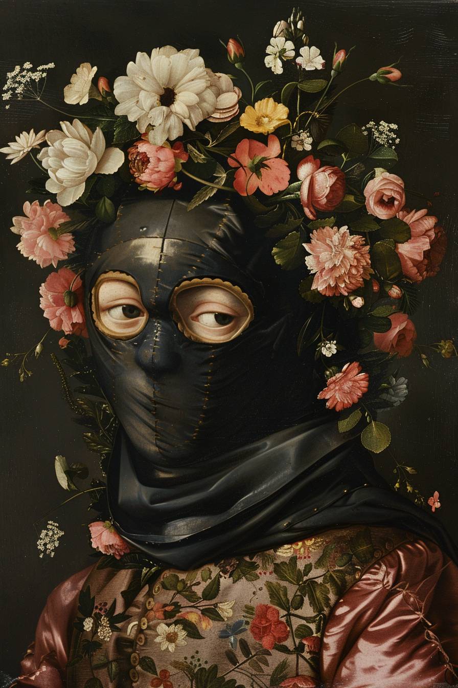 암브로시우스 벤슨의 작품으로, 발라클라바 마스크와 꽃 화관을 쓴 인물 초상화를 그린 것입니다.
