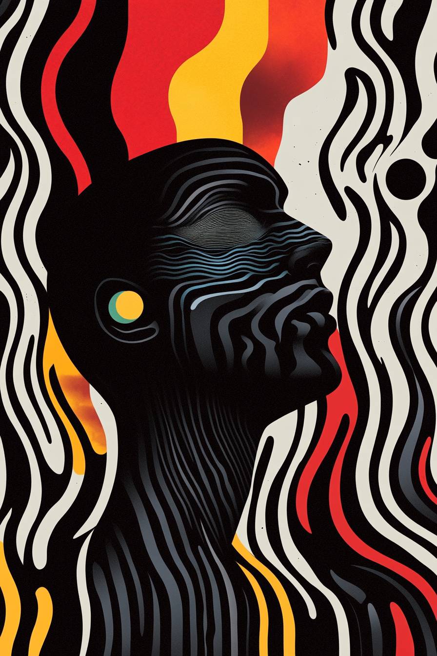 더블 노출 스타일, 남자아이와 늑대가 옆을 바라보는 일러스트 스타일, 간단한 디테일, 간단한 색상, 들판에 서 있는, 그림 스타일, 남자아이 속에 하늘이 있고, 늑대 속에 들판이 있는, 미니멀, 흐릿한 색상, 평면 일러스트