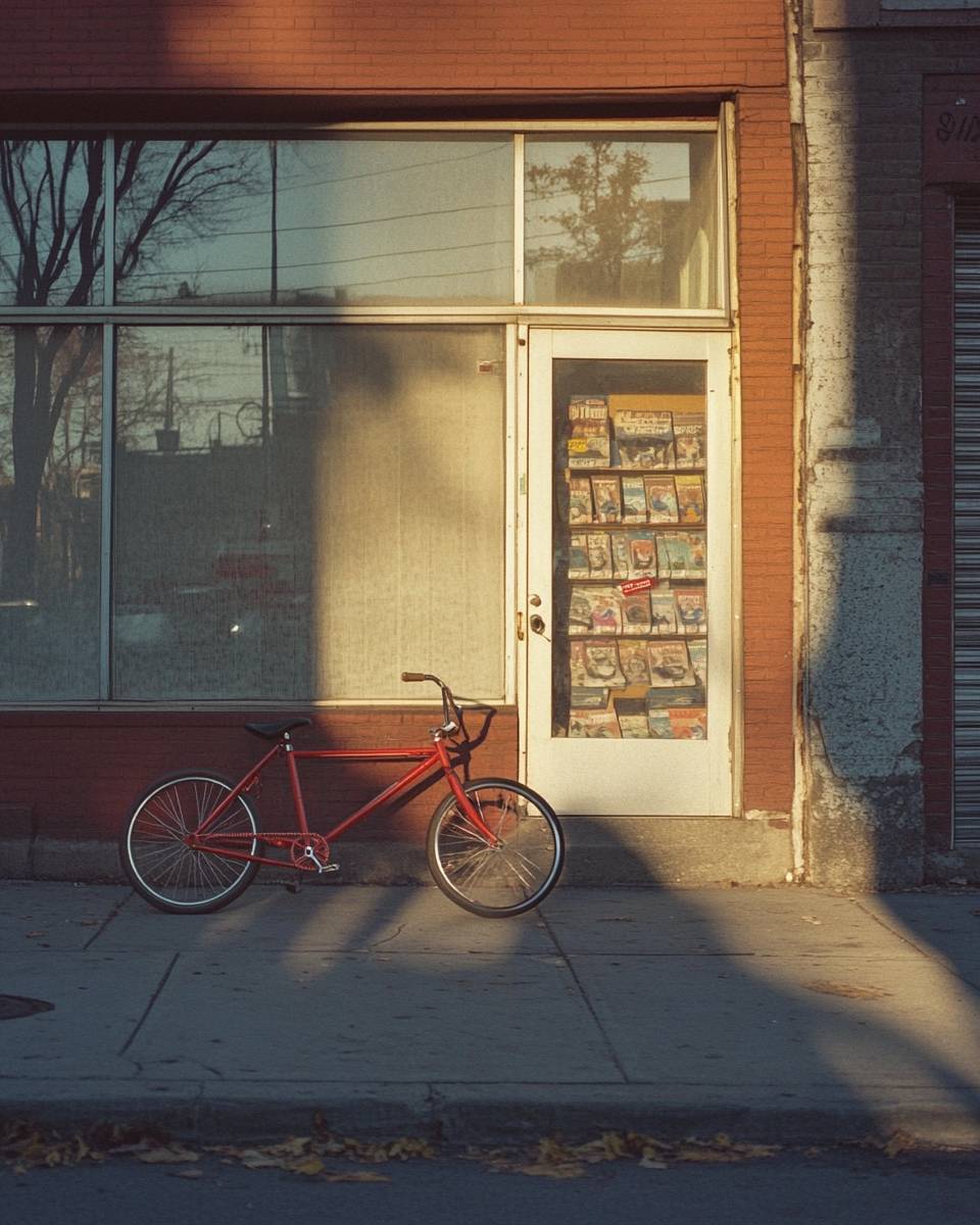 1990년대 비디오 대여점의 넓은 앵글 샷, 부드러운 아침 빛이 유리에 반사되어 있다. 빨간 BMX 자전거가 인도에 기대어 있다. 매우 상세하고 부드러운 아침 빛, 35mm 필름 사진.