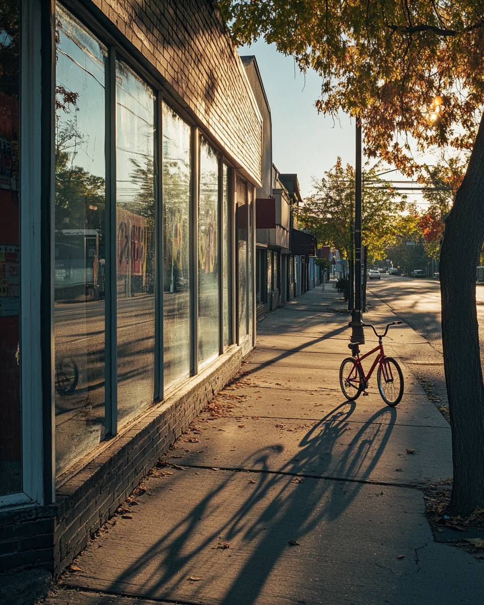 Wide-angle shot of a 1990s video rental store, soft morning light reflecting on the glass. A red BMX bike leans against the curb. Highly detailed, soft morning light, 35mm film photography, --ar 4:5 --style raw --v 6.1