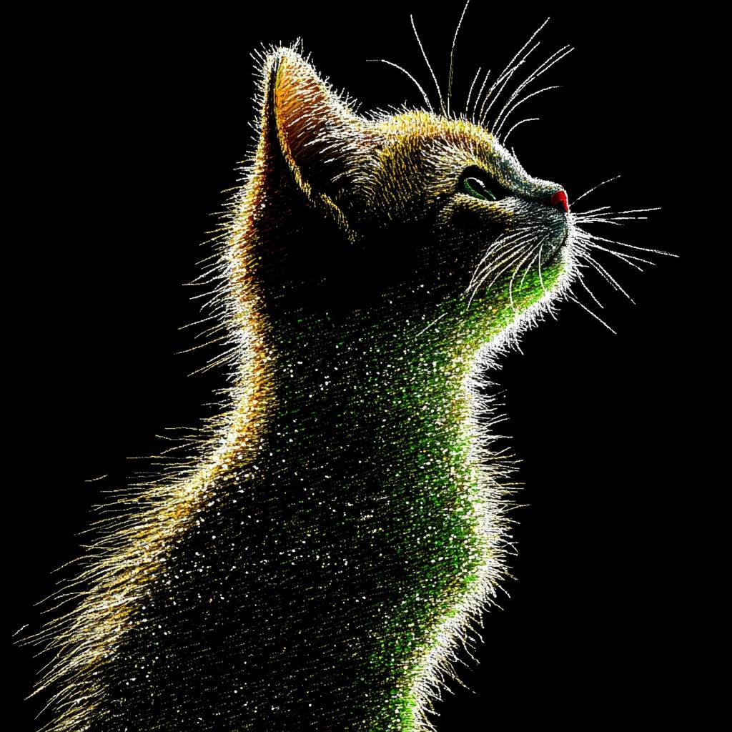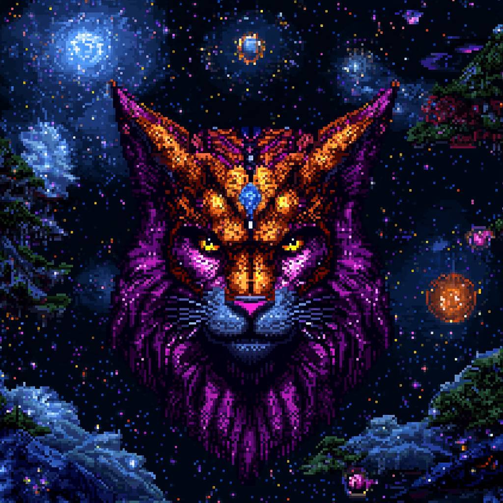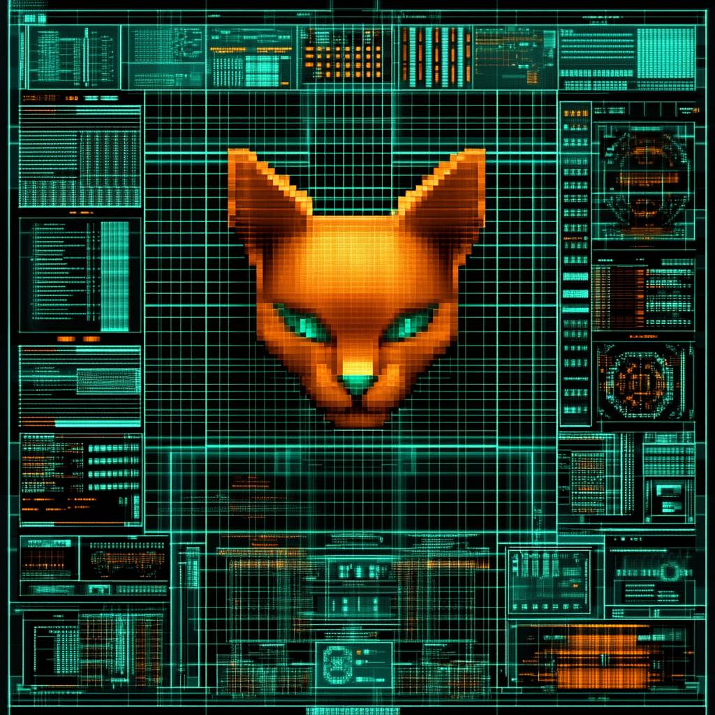 검은 배경 중앙에 있는 16비트 픽셀화 고양이 머리.