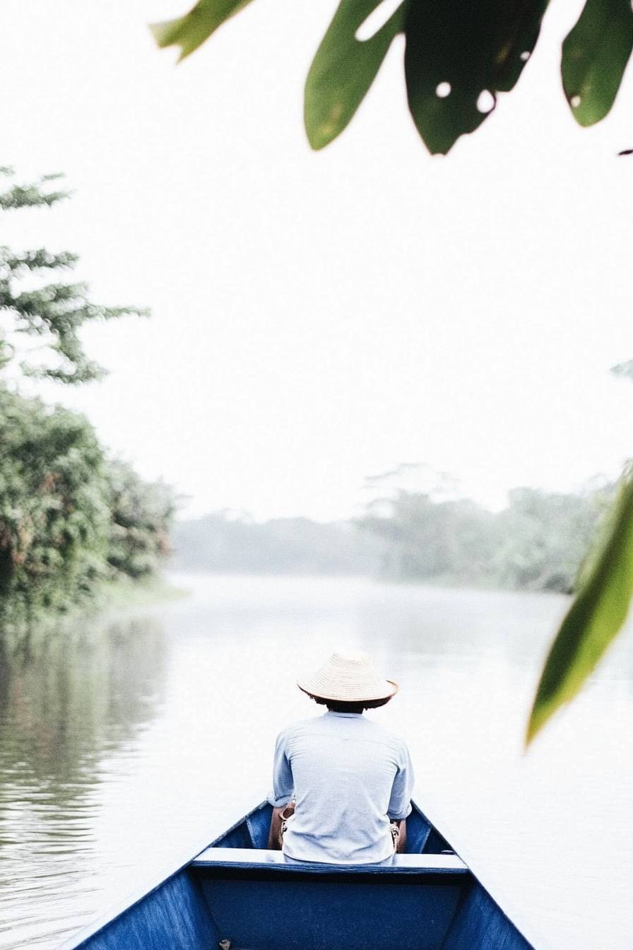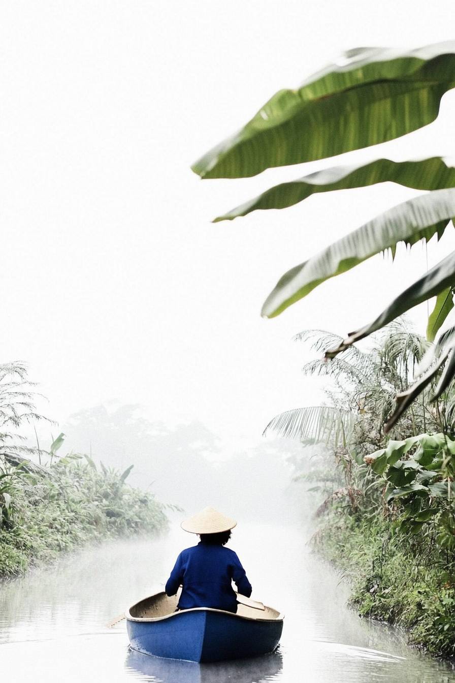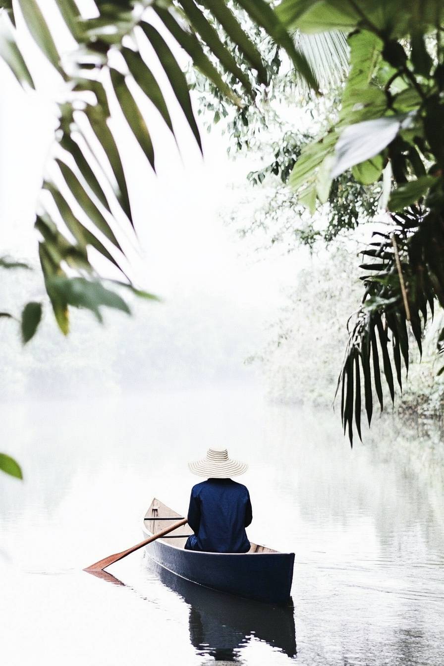 탐험가가 정글 강에서 배를 저으며 안개 낀 물과 덩굴을 지나간다.