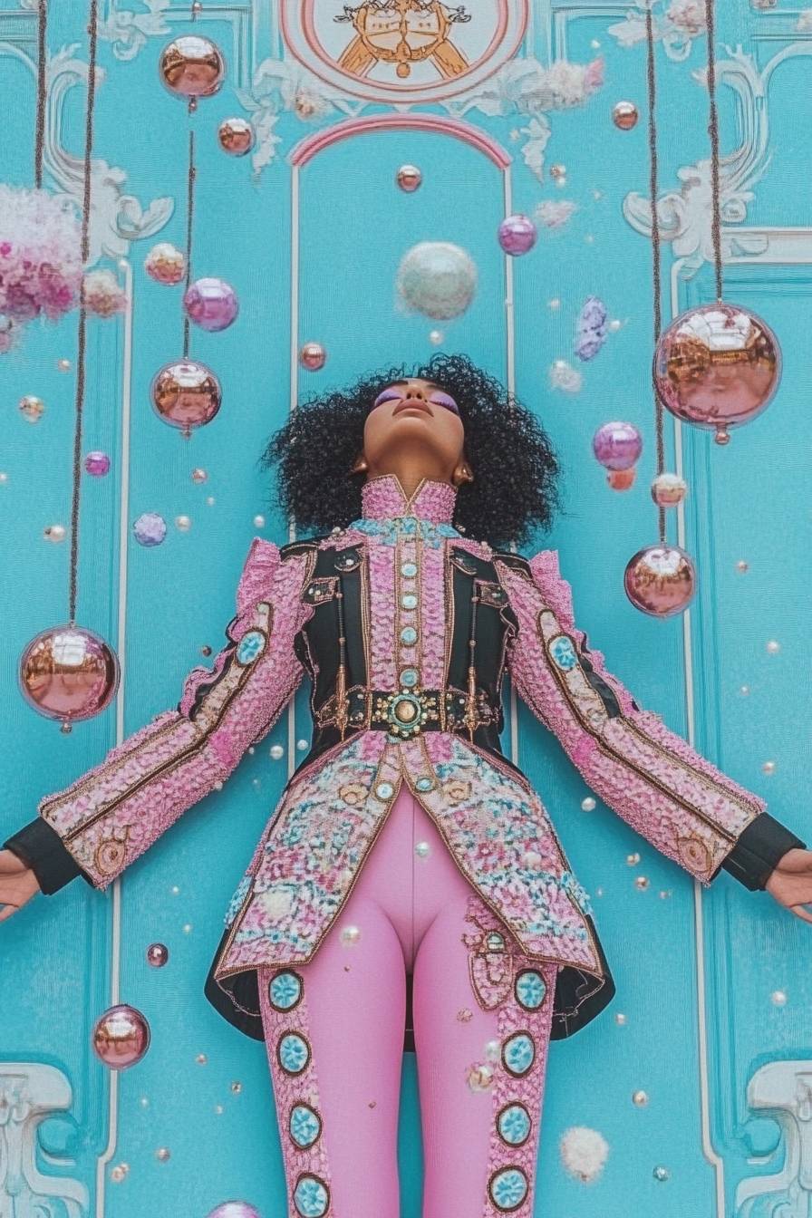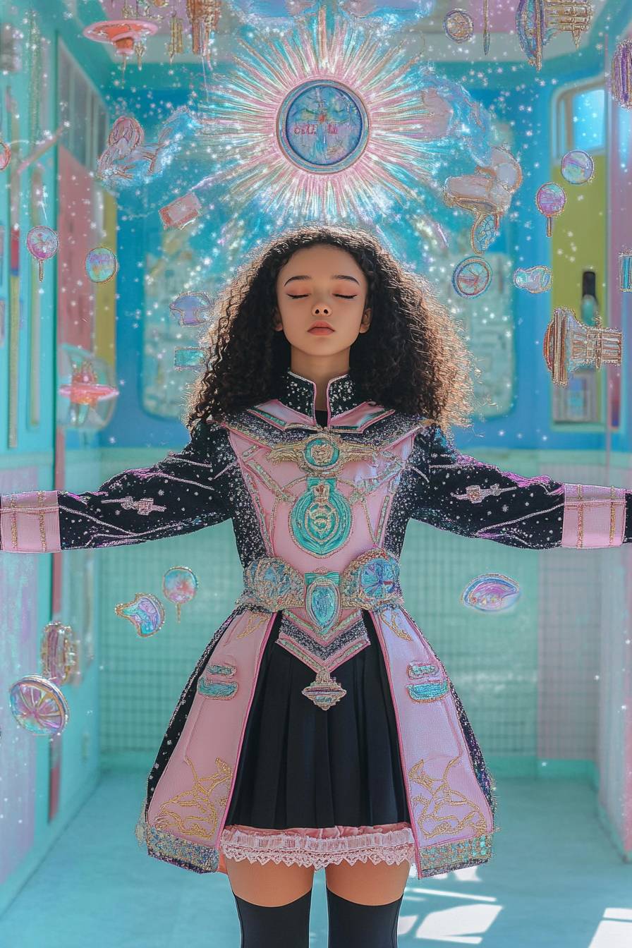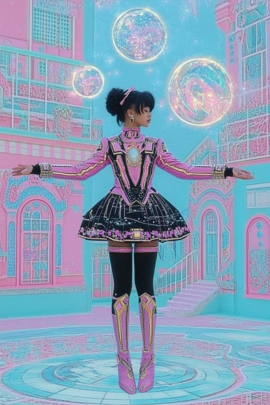 Lizzo cosplaying as Ochaco Uraraka from My Hero Academia, wearing a pink and black hero suit, floating objects around her, bright school setting, vibrant anime style --sref 2775150748 2775636911 --ar 2:3 --v 6.1