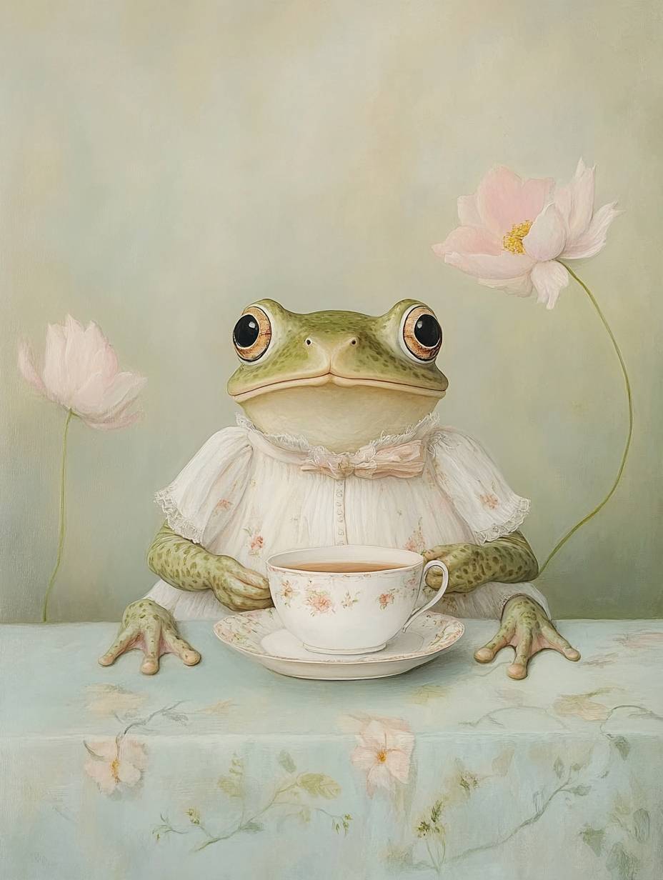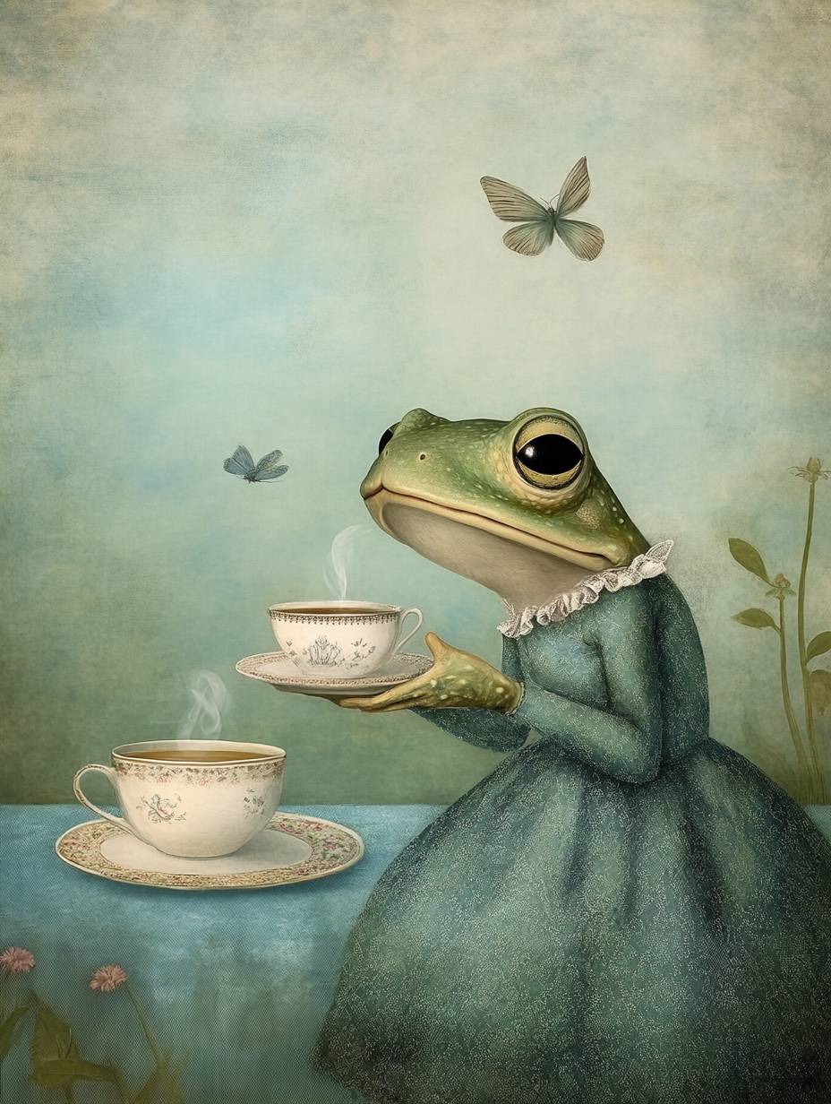 빅토리아 시대 드레스를 입은 두꺼비가 차를 마시고 있다, 비아트리크스 포터 스타일.