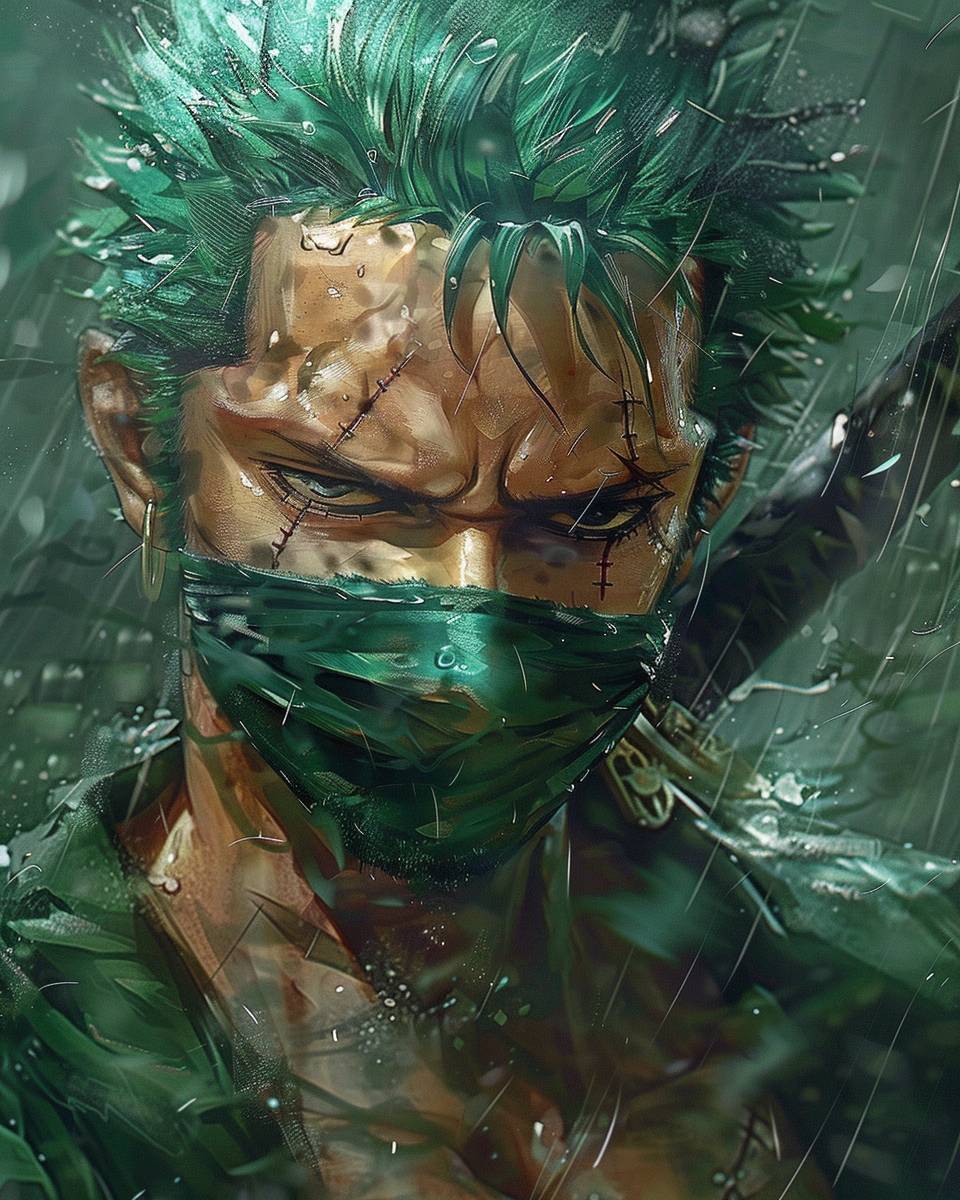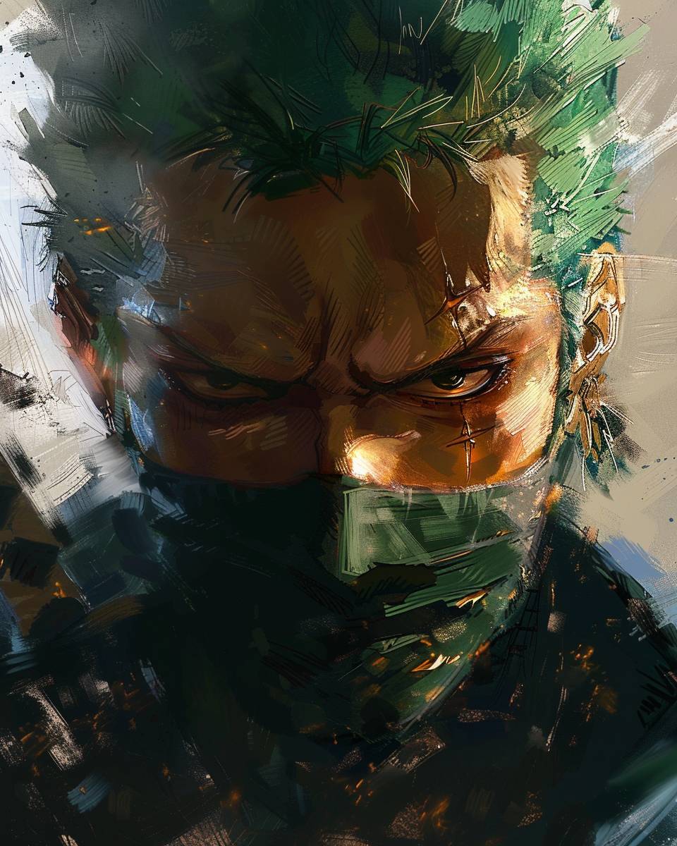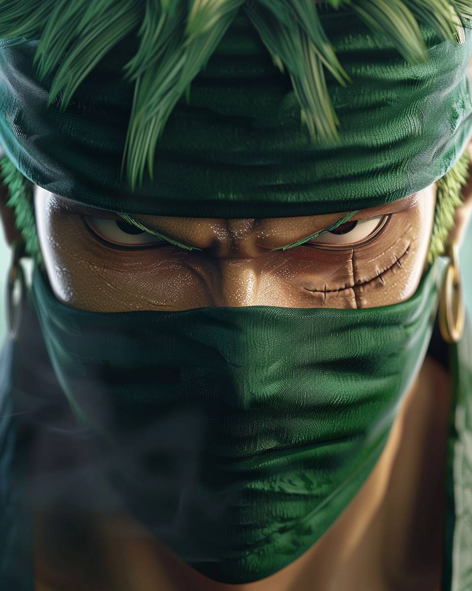 닌자 마스크를 쓴 원피스의 조로의 서사적인 초상화를 그리며, 선명한 클로즈업 풀 HD 32K 해상도로 최대의 임팩트를 전달합니다.