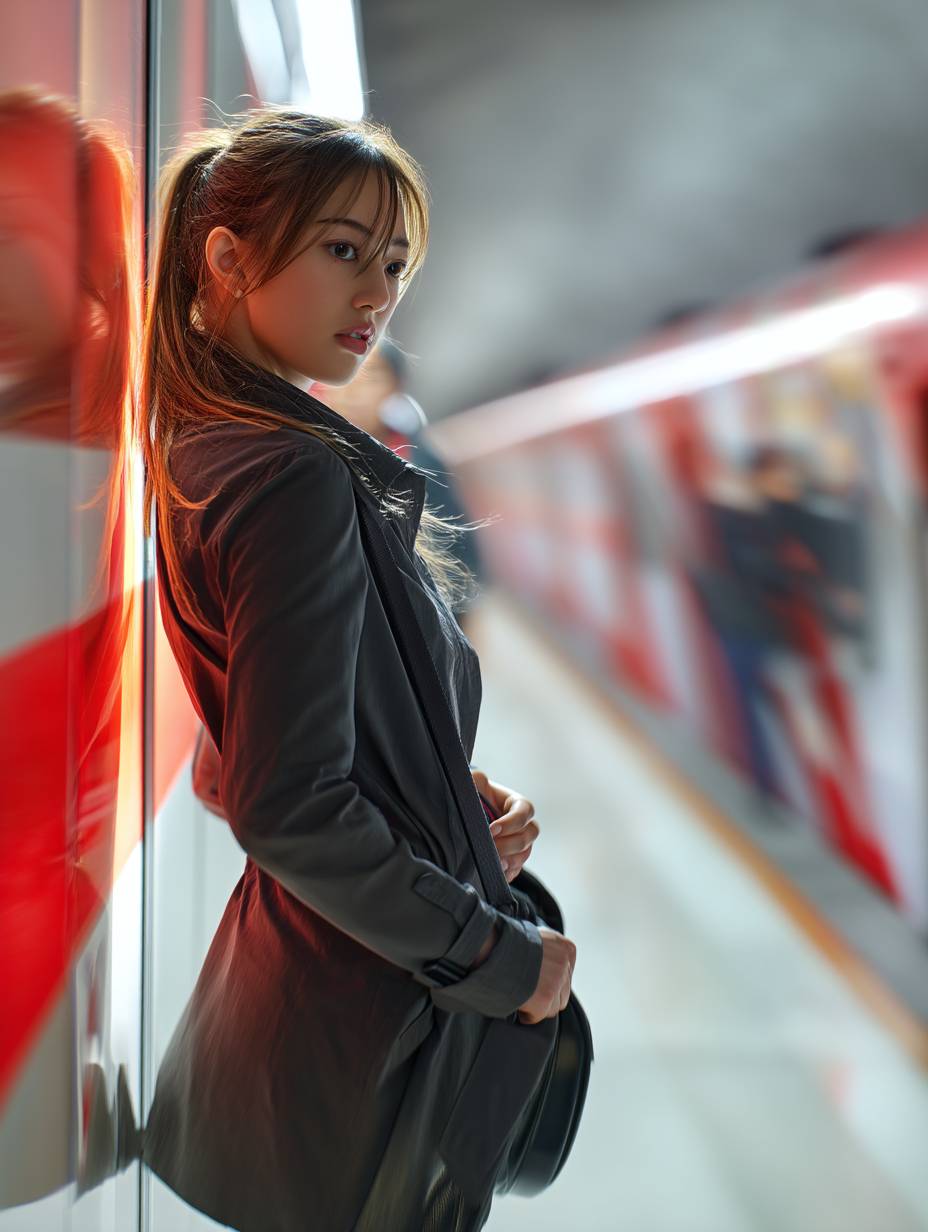 qh realistic photo,asian, ,qh realistic photo,asian,A modern, minimalist fashion photo portrait. The model is in motion on an underground station platform, with blurred movement. The scene features red and white stripes, glass reflections, and soft light. The image depicts a Korean female model with brown hair wearing dark , standing next to a subway train, in the style of a minimalist fashion photographer --ar 3:4 --v 7.0 --p e8qdz8b