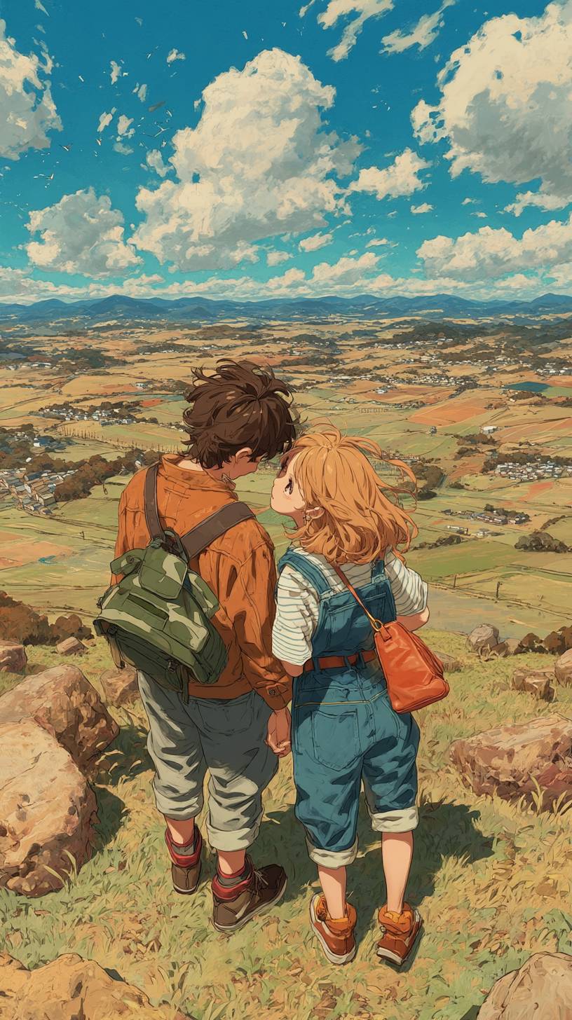 젊은 커플이 언덕 꼭대기에서 나란히 서서 눈을 부드럽게 감고 얼굴을 하늘로 향하며 따뜻한 봄바람을 부드럽게 즐기고 있습니다. 하늘은 부드럽고 희망적인 색으로 밝아 현대적인 의상을 입은 어른들의 로맨틱한 분위기를 자아내며 하늘과 경치가 아름답게 세밀하게 표현되어 있습니다.