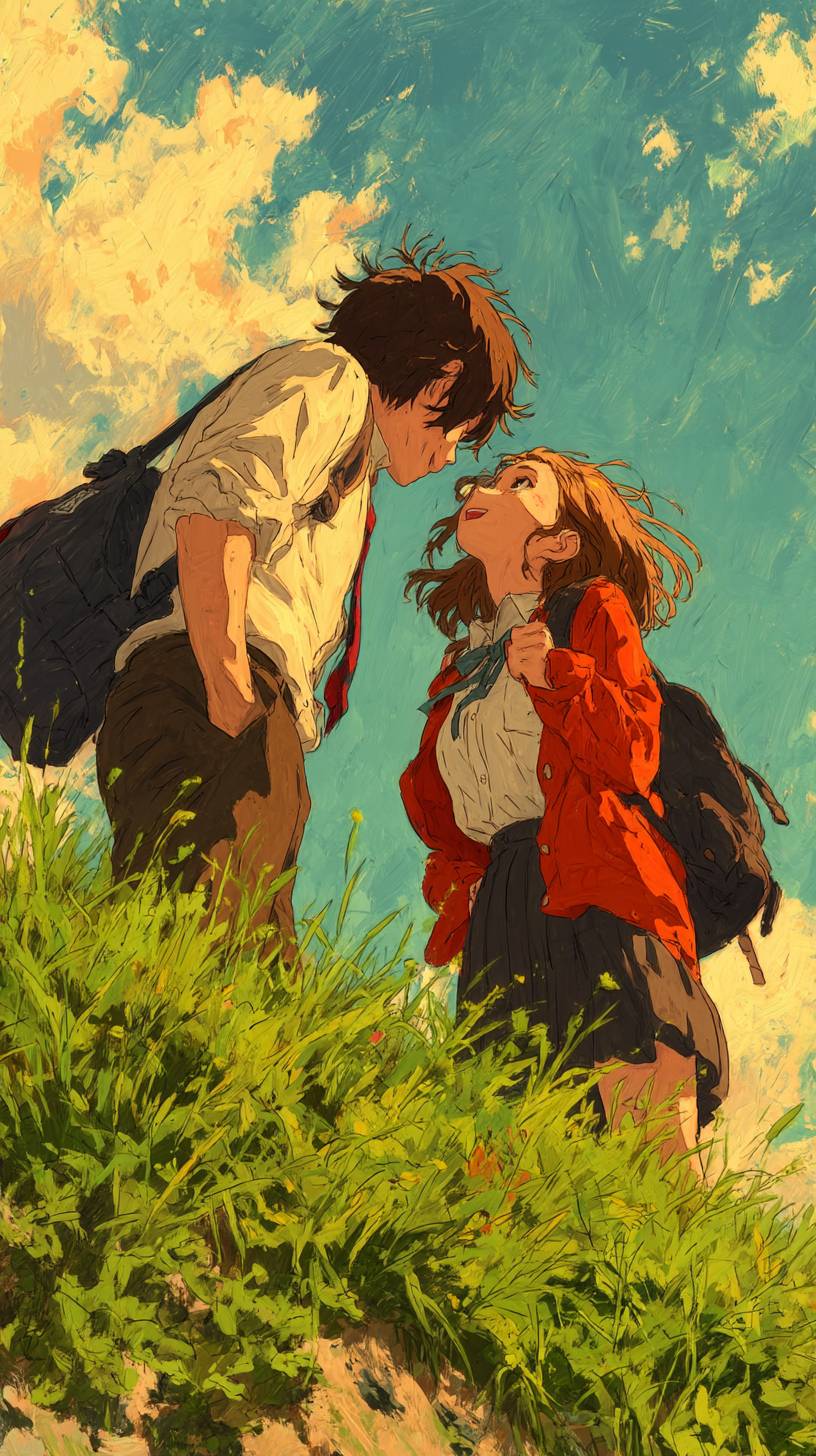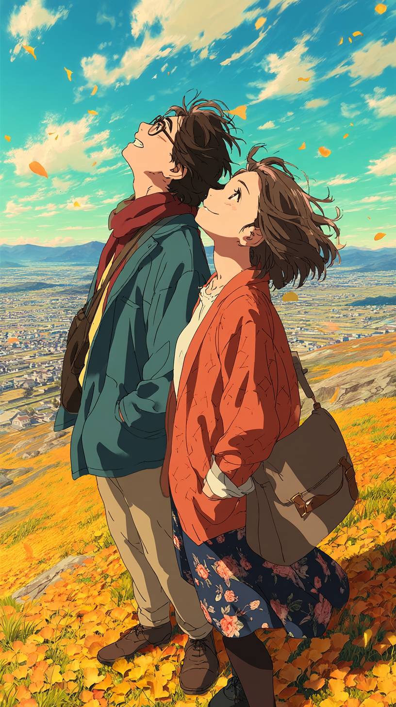 Anime-style image of a young couple standing closely side-by-side on a hilltop, their eyes gently closed as they lift their faces together toward the open sky, softly enjoying a warm spring breeze, sky bright with gentle hopeful colors, modern clothing, adult romantic atmosphere, beautifully detailed sky and scenery. --chaos 20 --ar 9:16 --stylize 600 --v 7.0 --raw