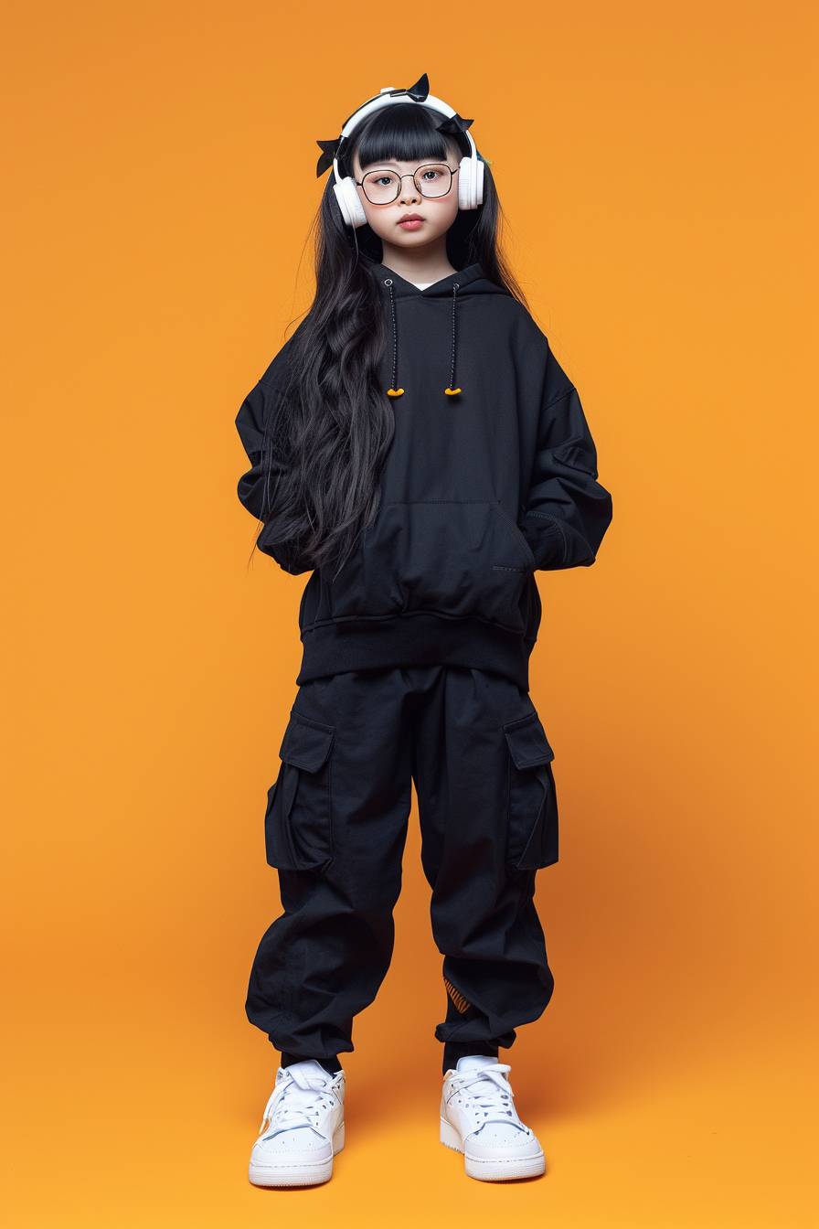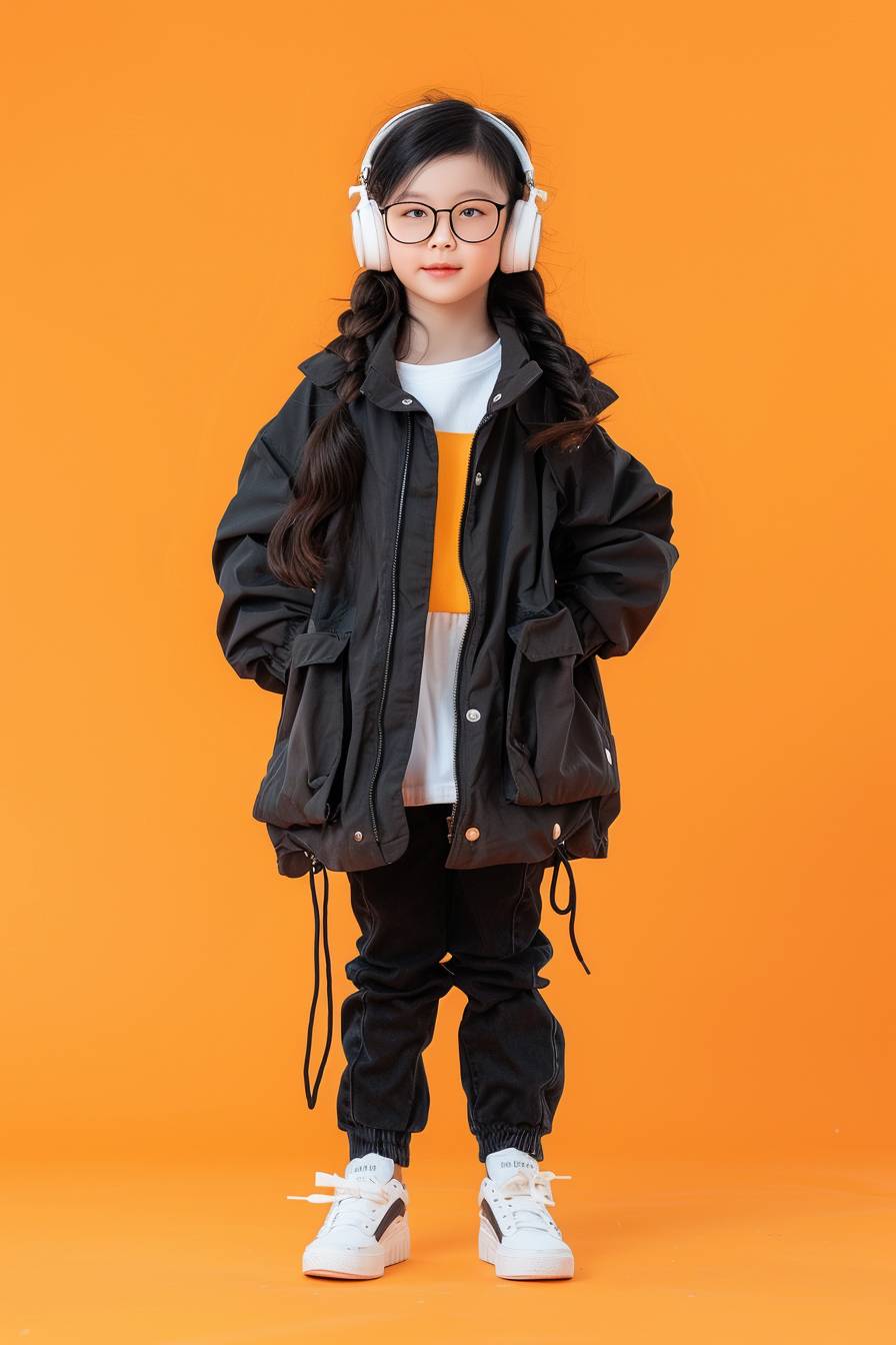 A cute Chinese girl with black long hair, wearing glasses and headphones on her head, dressed in trendy , stands upright against an orange background. She is also wearing white sneakers, while the photo captures full body shots of children's . The model showcases various fashionable outfits for boys, including black cargo pants, sports jackets, baseball caps, t-shirts, jeans, etc., with high-definition photography and professional studio lighting. The photography is in the style of high resolution. --ar 2:3 --v 6.0