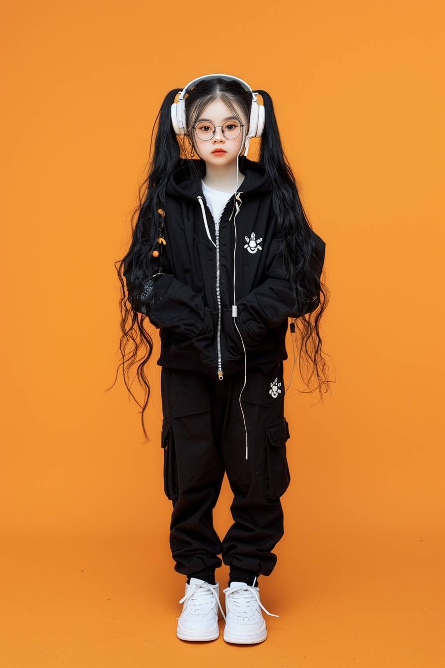 검은 긴 머리를 가진 귀여운 중국 소녀가 안경과 헤드폰을 착용하고 트렌디한 옷을 입고 주황색 배경에 똑바로 서 있습니다. 그녀는 흰색 운동화도 신었고, 사진은 아이들의 전신 샷을 담고 있습니다. 모델은 검은 카고 바지, 스포츠 재킷, 야구 모자, 티셔츠, 청바지 등 남자아이들을 위한 다양한 패셔너블한 의상을 선보이고 있습니다. 고화질 사진 및 전문 스튜디오 조명이 적용되었습니다. 사진 촬영은 고해상도 스타일입니다.