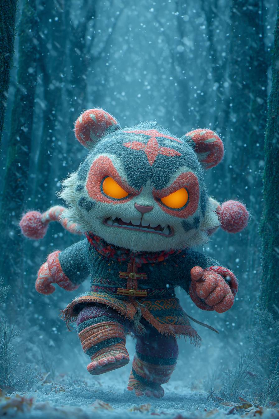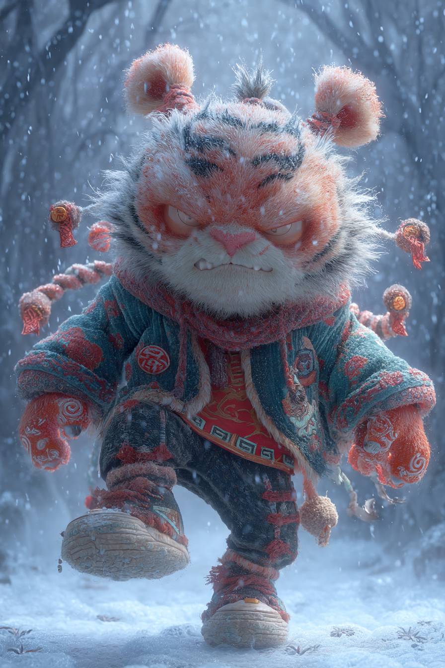 독특하고 독창적인 디자인의 의상을 입은 3D 시네마틱 품질의 동북 호랑이가 눈송이가 떨어지는 겨울 숲에서 무술을 연습하고 있습니다. 호랑이의 털은 세밀한 텍스처를 가지고 있으며, 사실적인 조명이 장면을 더욱 돋보이게 합니다. 이 작품은 '쿵푸 팬더'의 본질을 포착하고 선명한 색감으로 표현됩니다. 의상은 고대 중국 토템과 얼음 결정 모양에서 영감을 받은 패턴이 특징으로, 신비로움과 차가운 날씨의 매력을 더합니다. 호랑이의 표정은 사납고 결연하여 어떤 도전에도 맞설 준비가 되어 있는 듯합니다.