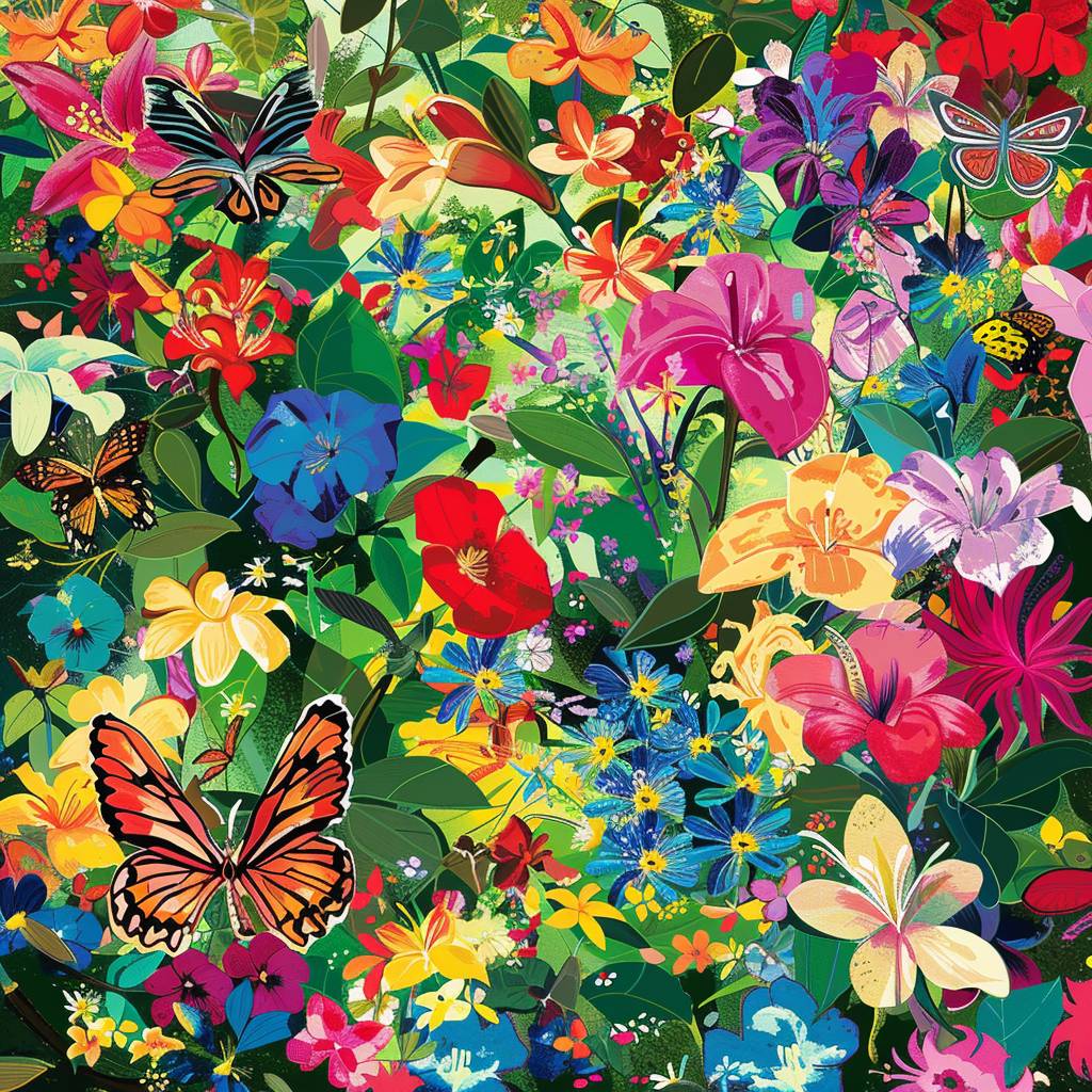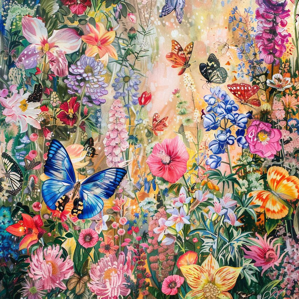 A beautiful garden filled with colorful flowers and butterflies. The air is filled with the scent of blooming blossoms. In the style of a botanical drawing by Emilio Pucci --v 6.0