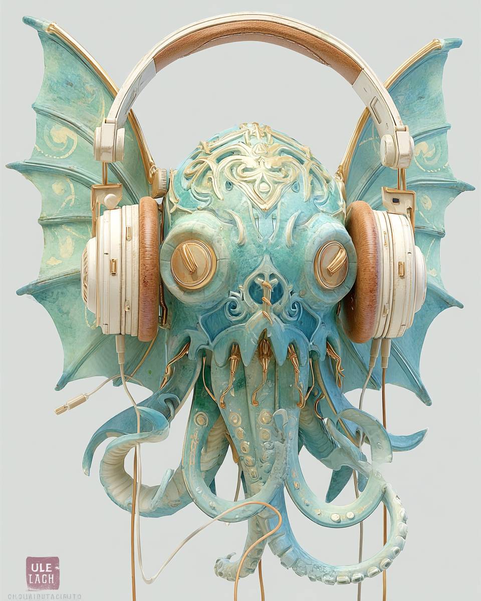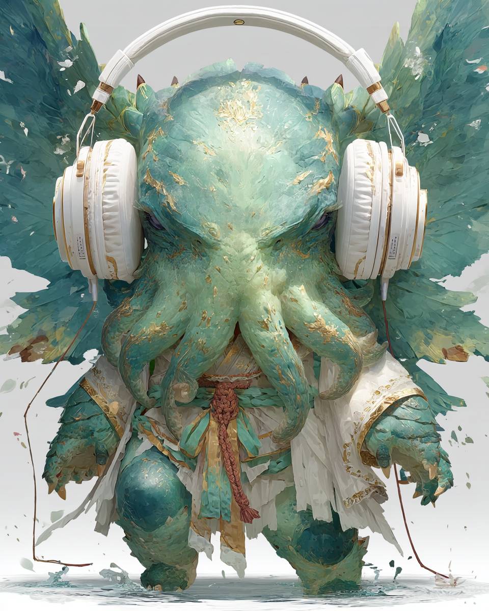 super cute green winged Cthulhu, large white headphones, sleeping, full body winged Cthulhu, chibi, transparent background, 3d, oc, super details, 24mm les Surrealist-Impressionist Abstract Fusion, watercolor painting art, in the style of Heyshiro --chaos 50 --ar 4:5 --stylize 1000 --v 7.0