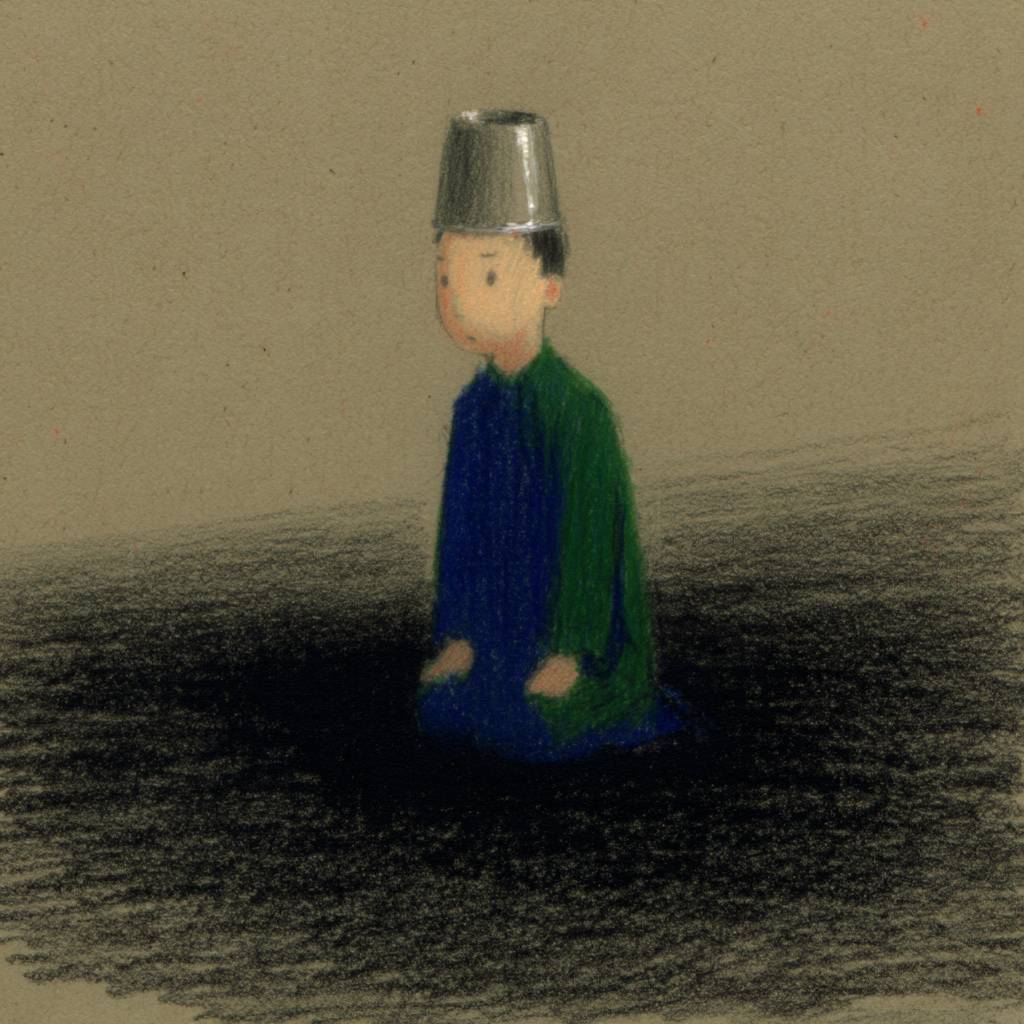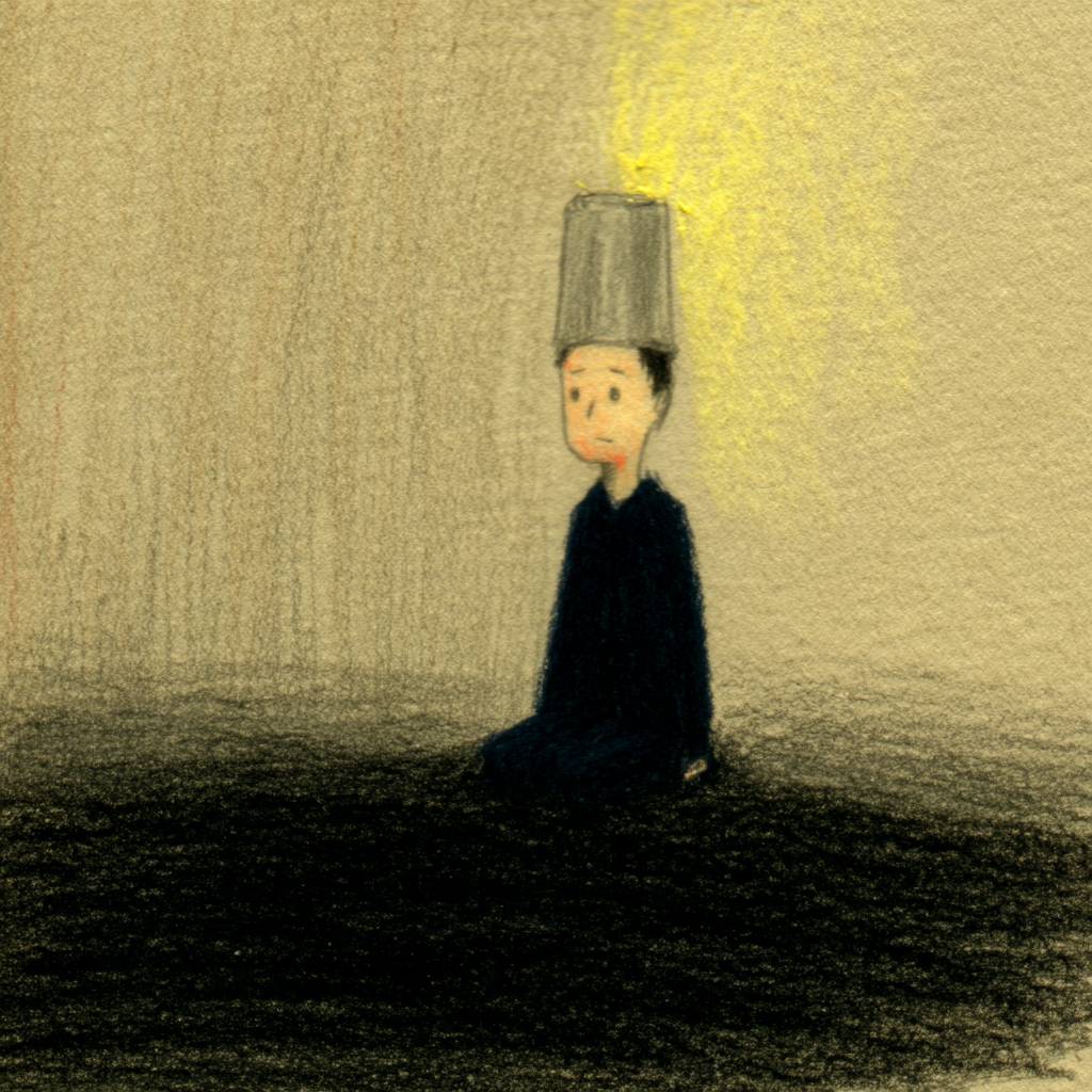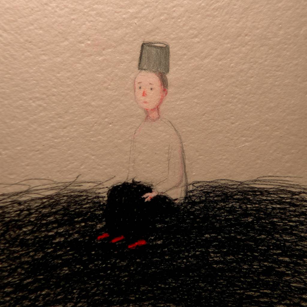4살 어린이 스타일의 단순한 그림, 인물이 철제 양동이를 머리에 얹고 발이 검은 안개에 뿌리내리고 있다.