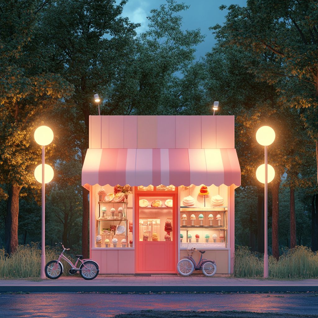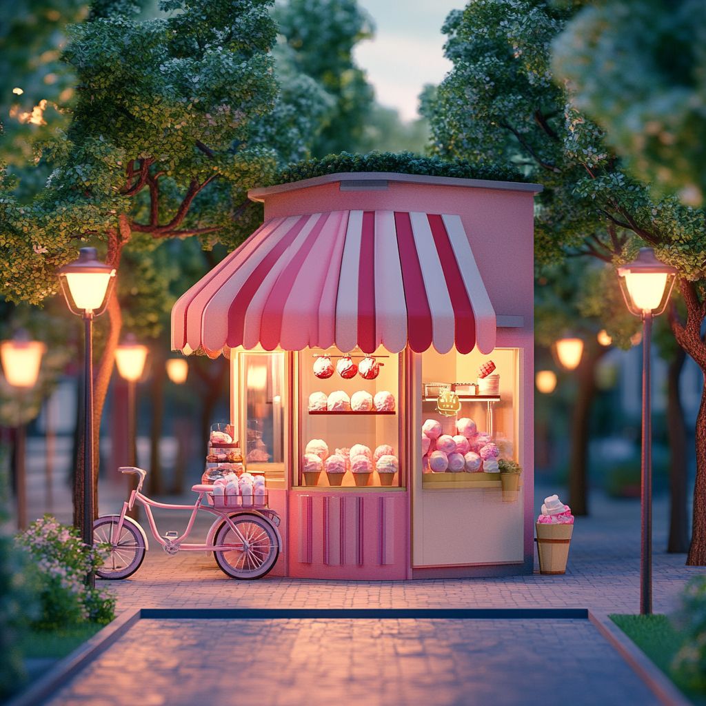 귀엽고 분홍색과 빨간색의 아이스크림 가게와 그 옆에 작은 자전거가 있으며 나무와 거리의 램프에 둘러싸여 있다.