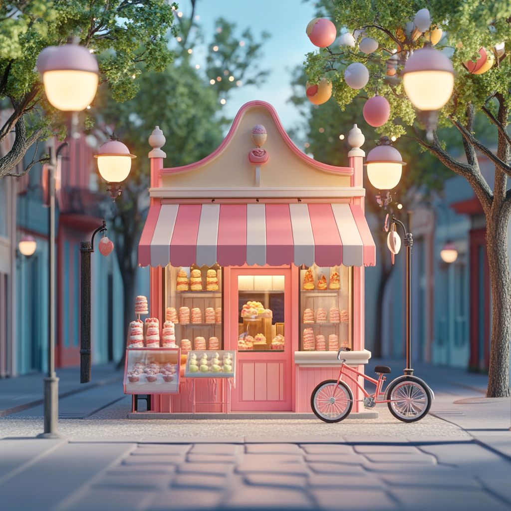 거리의 귀엽고 분홍색과 빨간색 아이스크림 가게의 3D 렌더링, 옆에는 작은 자전거가 있으며 나무와 가로등으로 둘러싸여 있습니다. 배경에는 아이스크림 롤리팝이 있으며, 가게 안에서 빛이 새어나옵니다. 앞면 뷰는 파스텔 색상과 부드러운 조명으로 구성되어 있으며, 이미지의 세부 사항이 풍부하고 고해상도입니다.