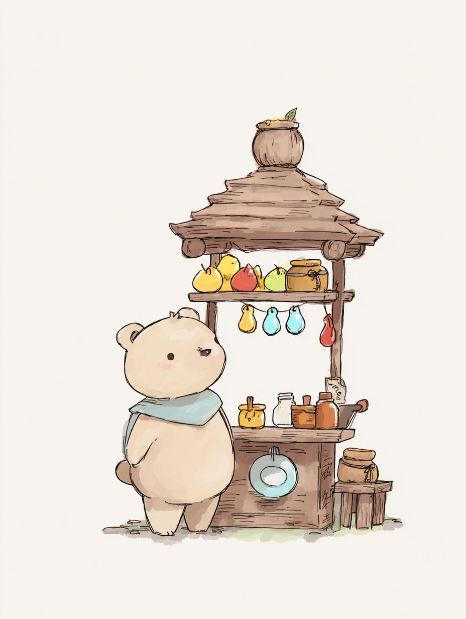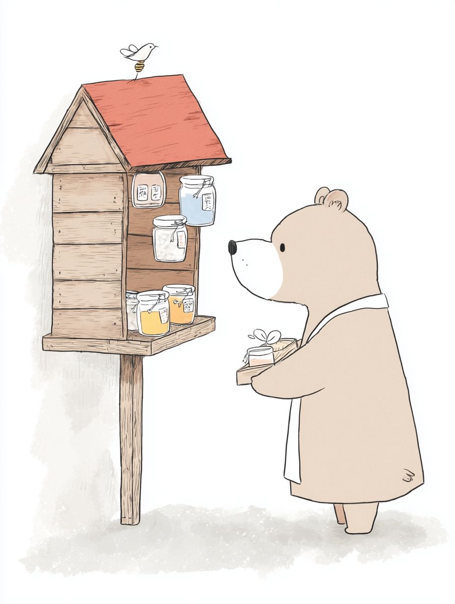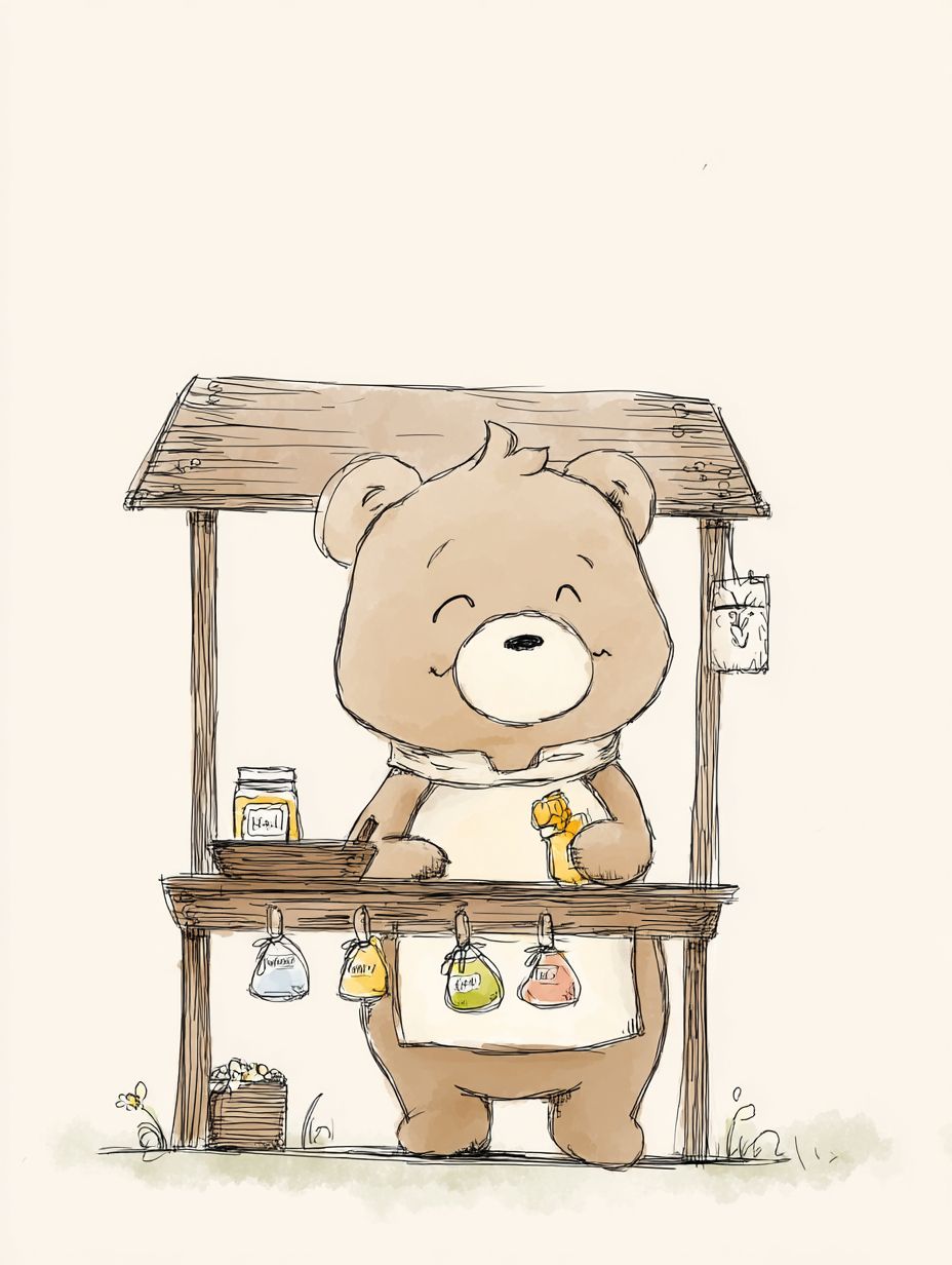 an illustration of a bear selling honey from a stand --ar 3:4 --profile fsgq962 --v 7.0