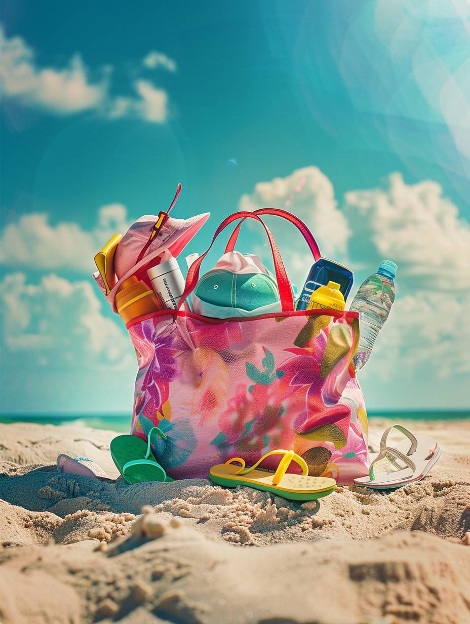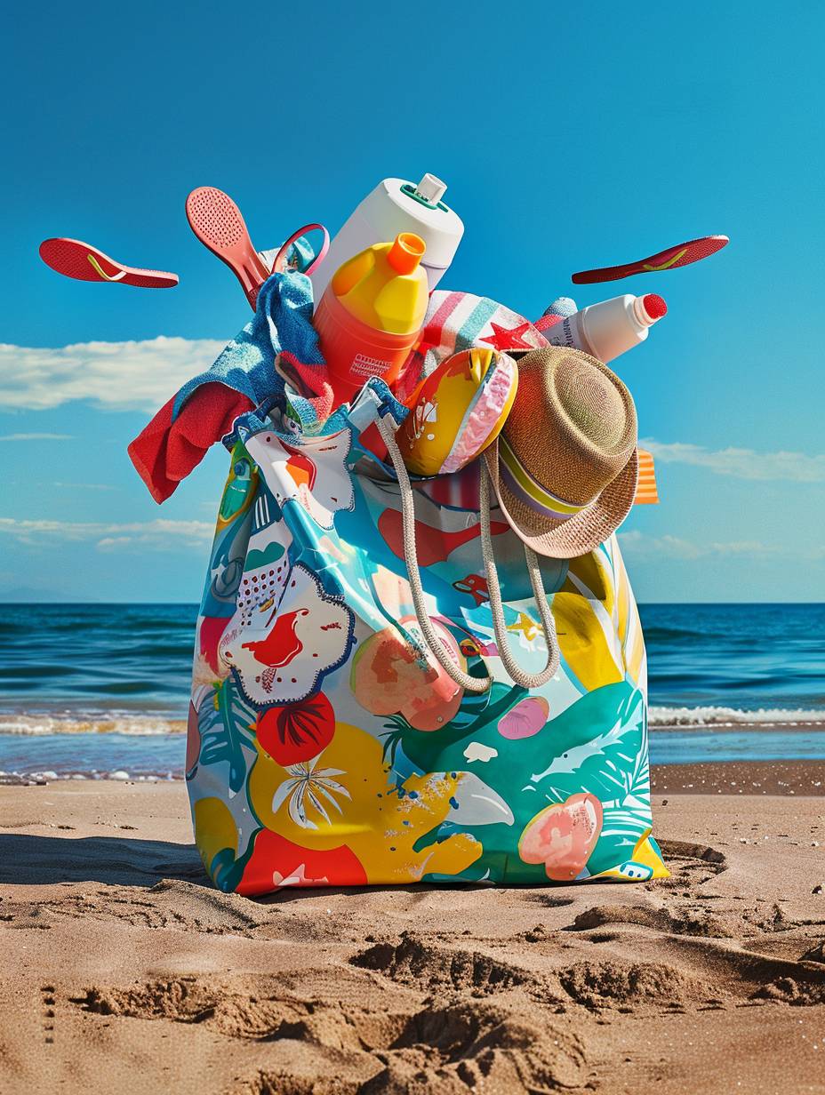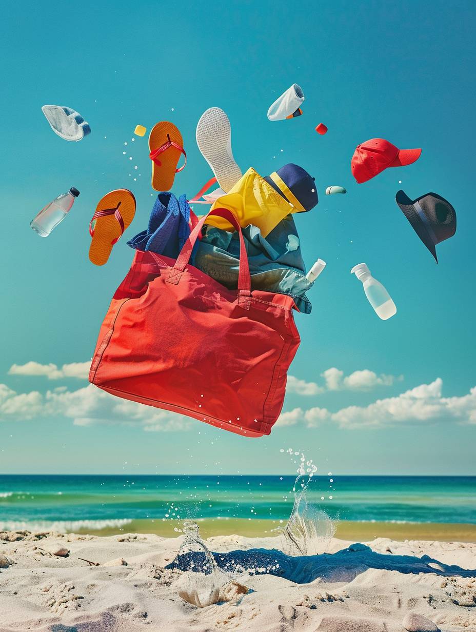 advertising photograph, a bag on the beach, all the contents of the bag are floating out the top of the bag, suncream, flip flops, baseball cap, towel, water bottle, bright and poppy colors --ar 3:4 --v 6.0