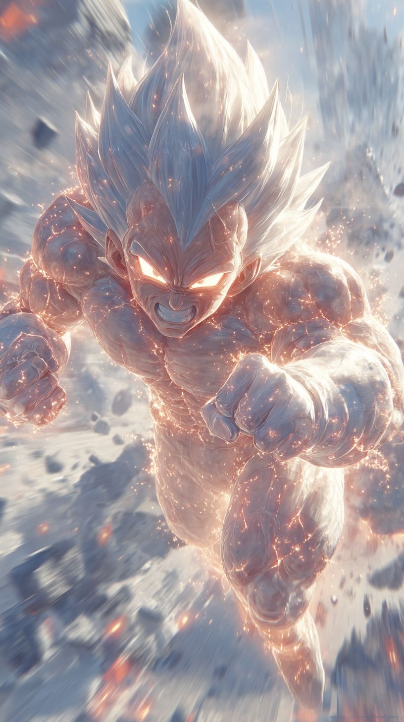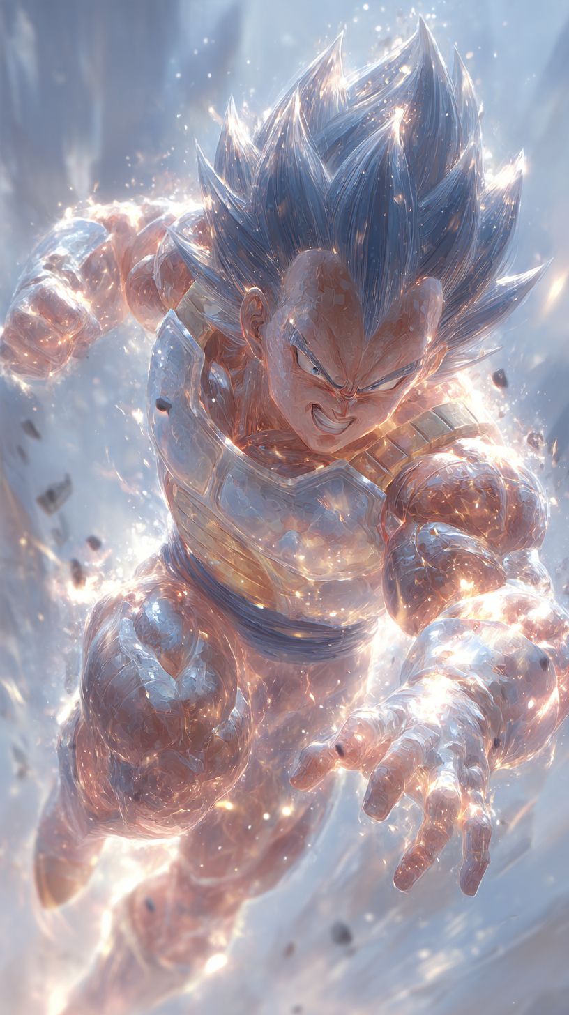 A dynamic anime illustration of Vegeta in Super Saiyan Blue Evolution form, launching a Final Flash at Broly, energy beam splitting the sky, debris flying, front angle with intense foreshortening. Background a shattered wasteland, firestorms brewing. Glowing edges with rim light, heatwave distortion. Created Using: Clip Studio Paint EX, shonen battle manga style, explosive lighting, HDR glow, sharp lineart, extreme contrast shadows, energy particle overlays, cinematic motion trails --ar 9:16 --exp 10 --raw --sref 633695773 417081226 307538589 416167608 3998011918 --sv 4 --stylize 1000 --v 7.0