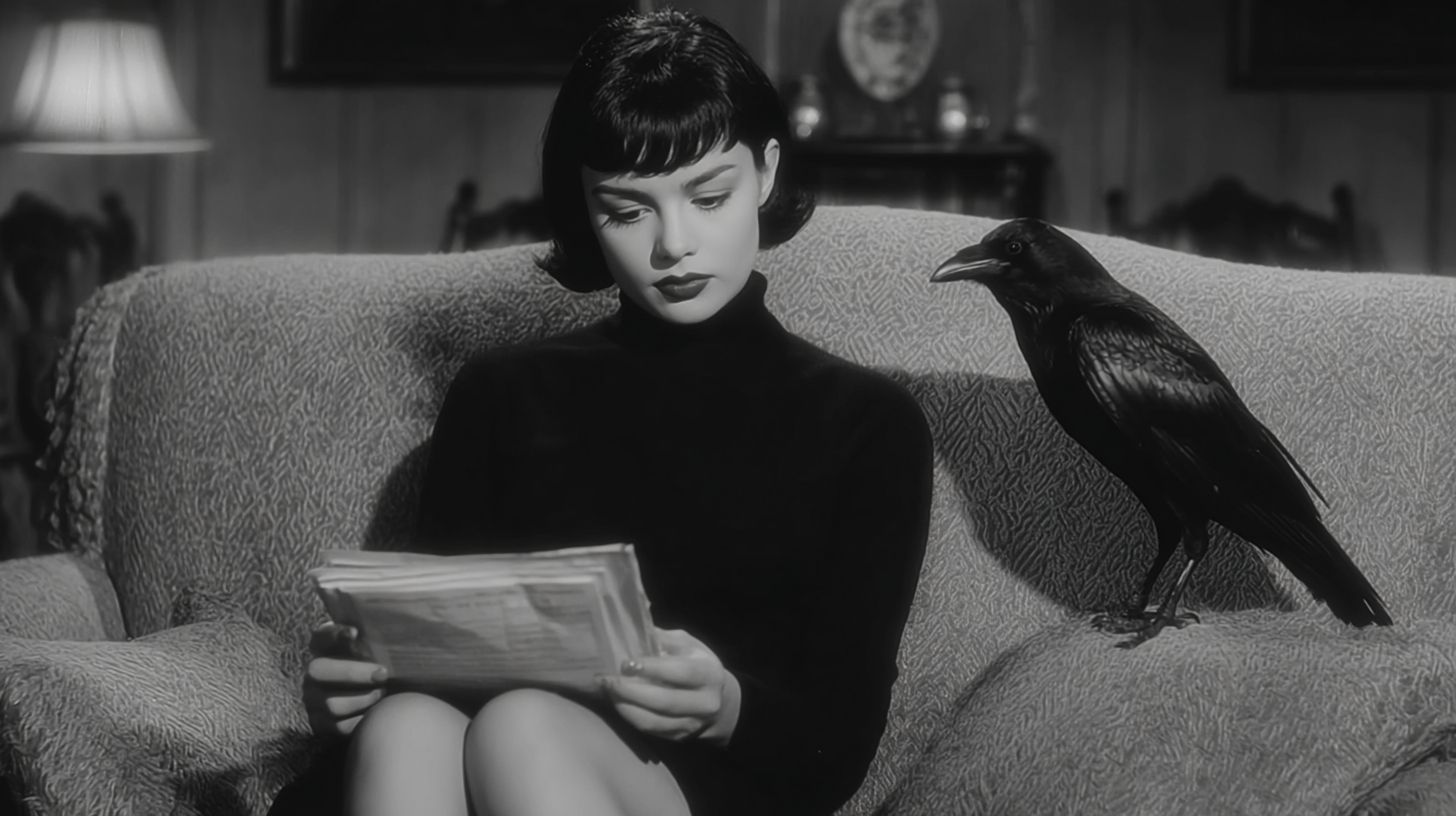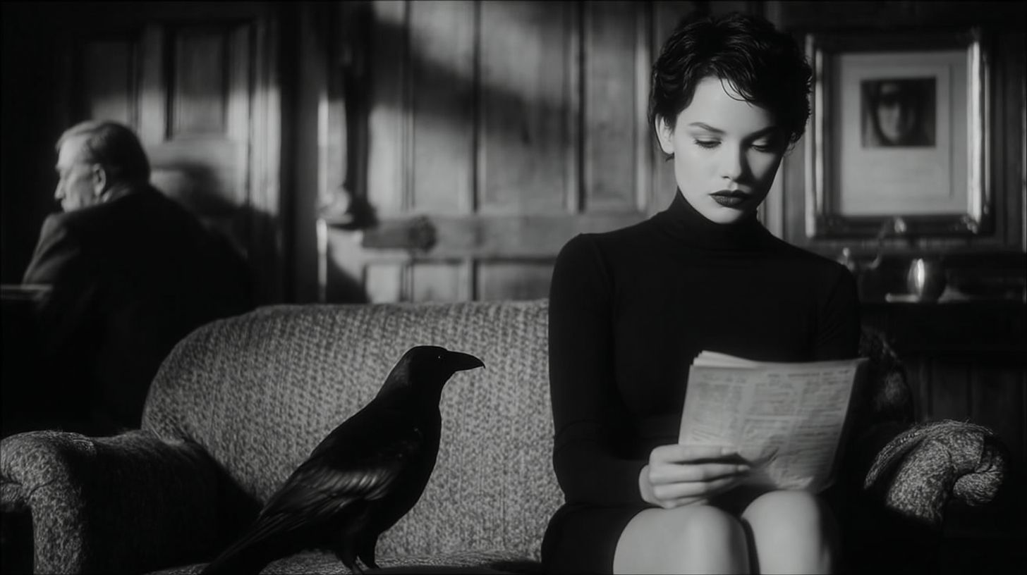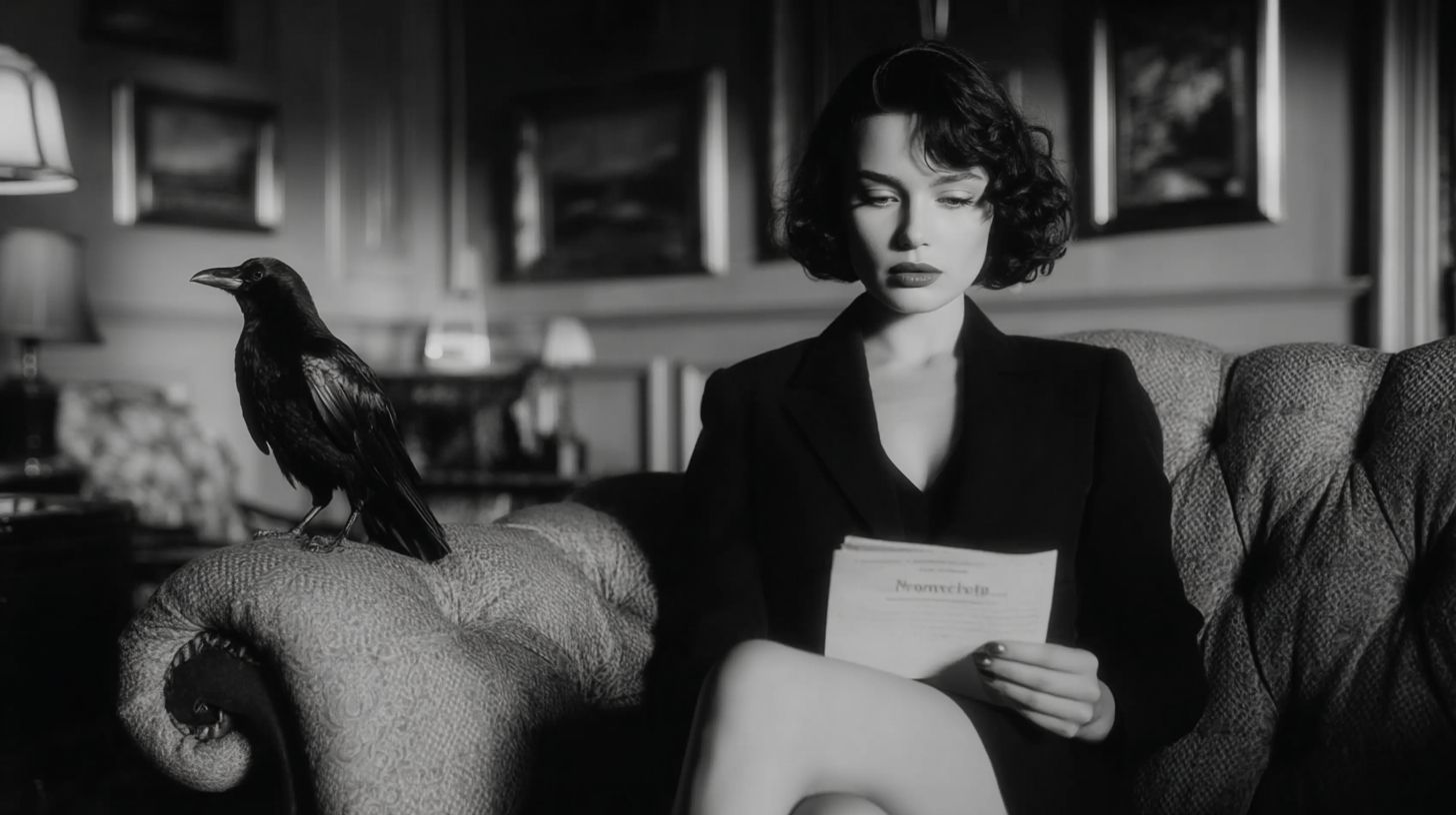 히치콕 스타일, 끔찍한, 영화적인 샷, 흑백 영화, 짧은 검은 머리를 가진 여성이 1인 소파에 앉아 있습니다. 그녀는 손에 서류 더미를 들고 있습니다. 여성은 문서를 보기 위해 고개를 숙이고 있습니다. 그녀의 무릎 위에는 까마귀가 서 있습니다. 방 안에는 다른 아무도 없습니다. 렌브란트의 빛이 여성에게 비치고 있습니다.