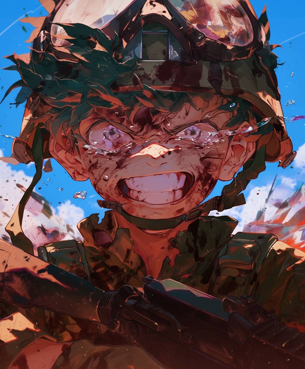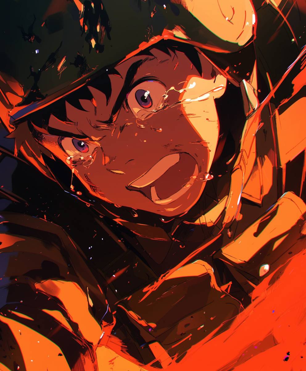facing camera, hero with a military helmet on his head, focus on his face, very happy expression, tears of hope, deep gaze, intense, intense action, intense emotion, anime style, Studio Ghibli, manga style, fluid animation, environment dynamic, detailed --ar 5:6 --niji 6