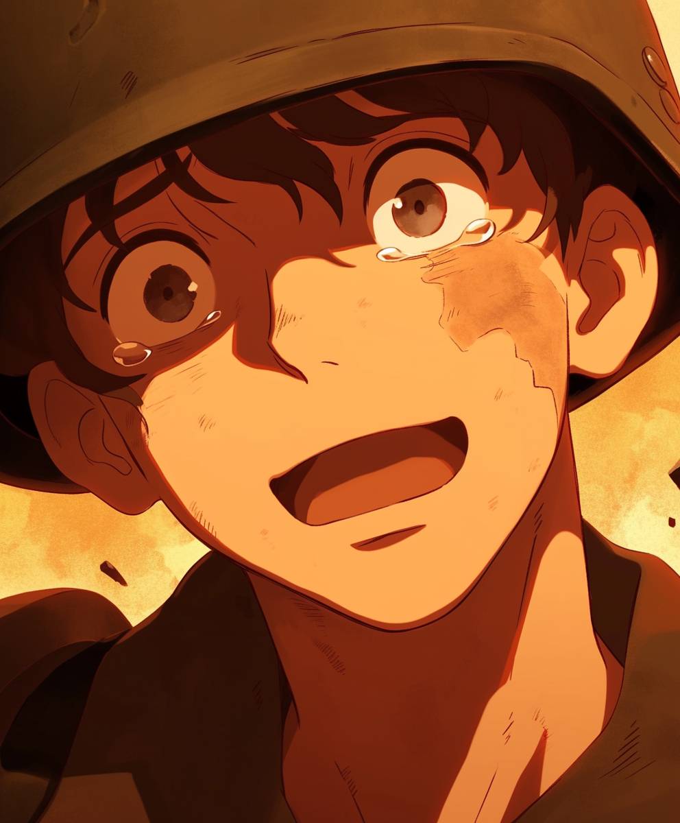 카메라를 향해 군헬멧을 쓴 영웅, 그의 얼굴에 집중, 매우 행복한 표정, 희망의 눈물, 깊은 시선, 강렬하다, 강렬한 액션, 강렬한 감정, 애니메이션 스타일, 스튜디오 지브리, 만화 스타일, 유동적인 애니메이션, 역동적인 환경, 세부정보가 풍부하다.