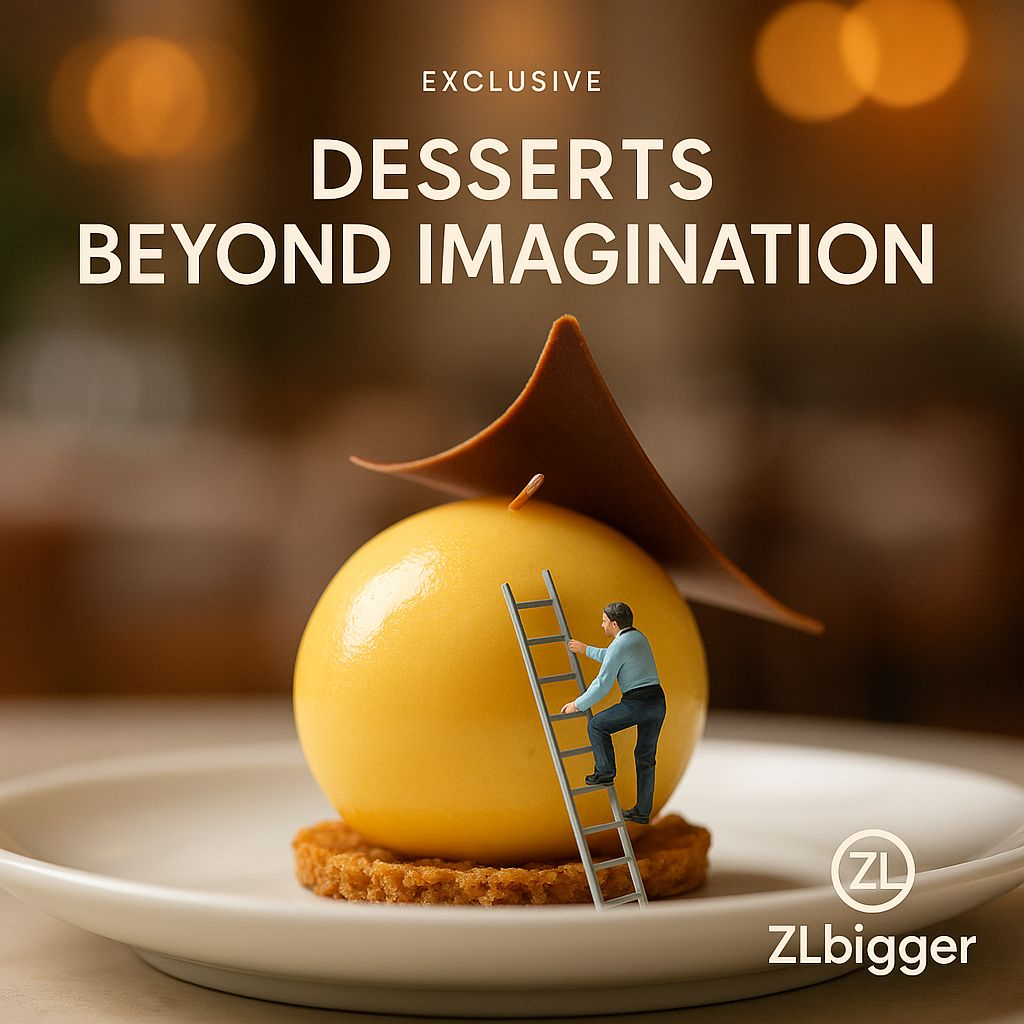 创意食品摄影广告为zlbigger,展示了品牌制作的创意高端超现实甜点,模糊的餐厅背景也与品牌装饰相符,强调甜点的对比,选择最适合此场景的口号, logo上方有小字,微型人正在与菜肴互动,超现实主义照明,柔和的软箱主光与温和的补光,浅景深,使用Canon EOS R5与RF 100mm f/2.8L微距镜头拍摄,光圈f/4,ISO 100,快门速度1/160秒——专业食品摄影风格,高端编辑质量,超现实但可信的场景,简约而巧妙的概念。