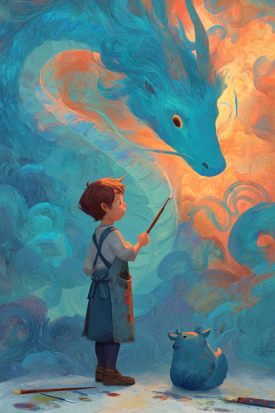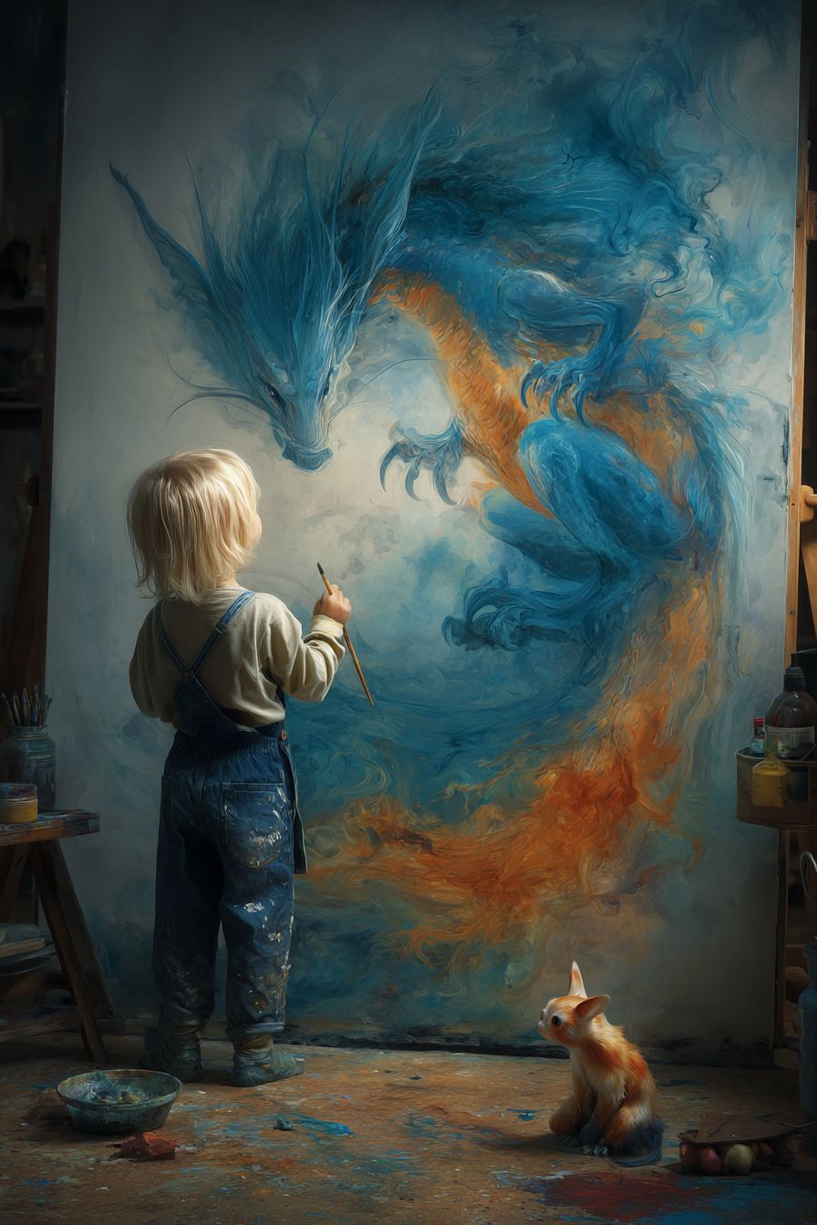 A young child in a painter's outfit, holding a brush, painting a vibrant, ethereal dragon made of swirling blue and orange watercolor strokes, with a small painted creature sitting nearby, in a dreamy, artistic studio setting. --ar 2:3 --v 7.0