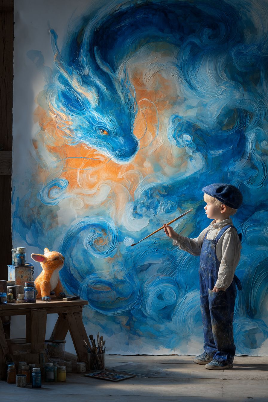 화가 의상을 입은 어린 아이가 붓을 들고 있으며, 회오리치는 파란색과 주황색 수채화 붓질로 만들어진 생생하고 비현실적인 드래곤을 그리고 있습니다. 근처에는 작은 그려진 생물이 앉아 있으며, 꿈같은 예술 스튜디오 환경입니다.