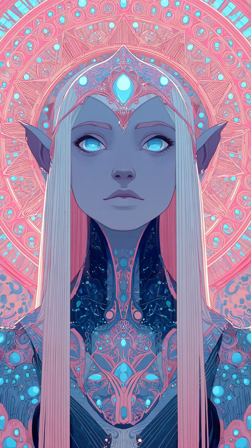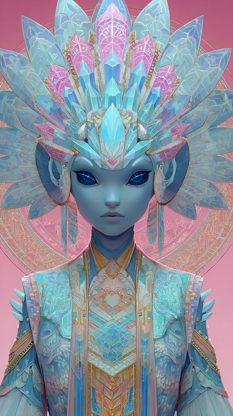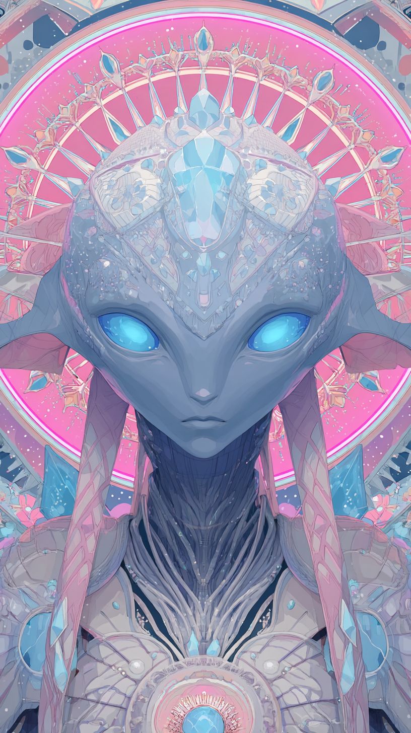 Beautiful alien goddess with glowing blue eyes that are almond shaped and solid blue wearing a crystal crown, a pastel rainbow in the style of digital painting and drawing inspired by Loish, detailed character illustrations, a magical light pink background with neon lights, a colorful Möbius strip --ar 9:16 --stylize 250 --v 7.0
