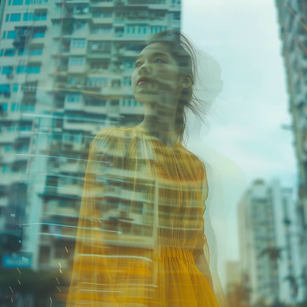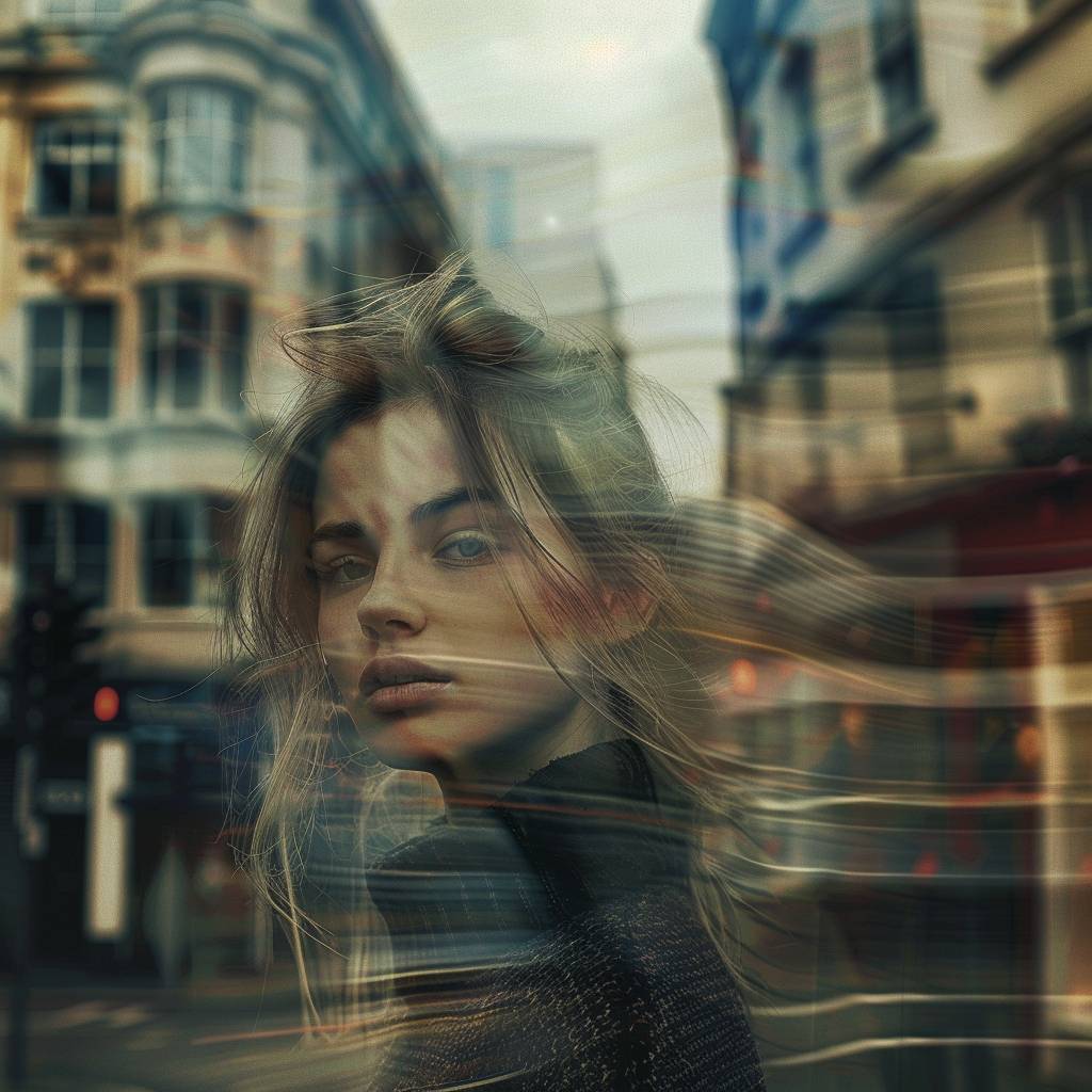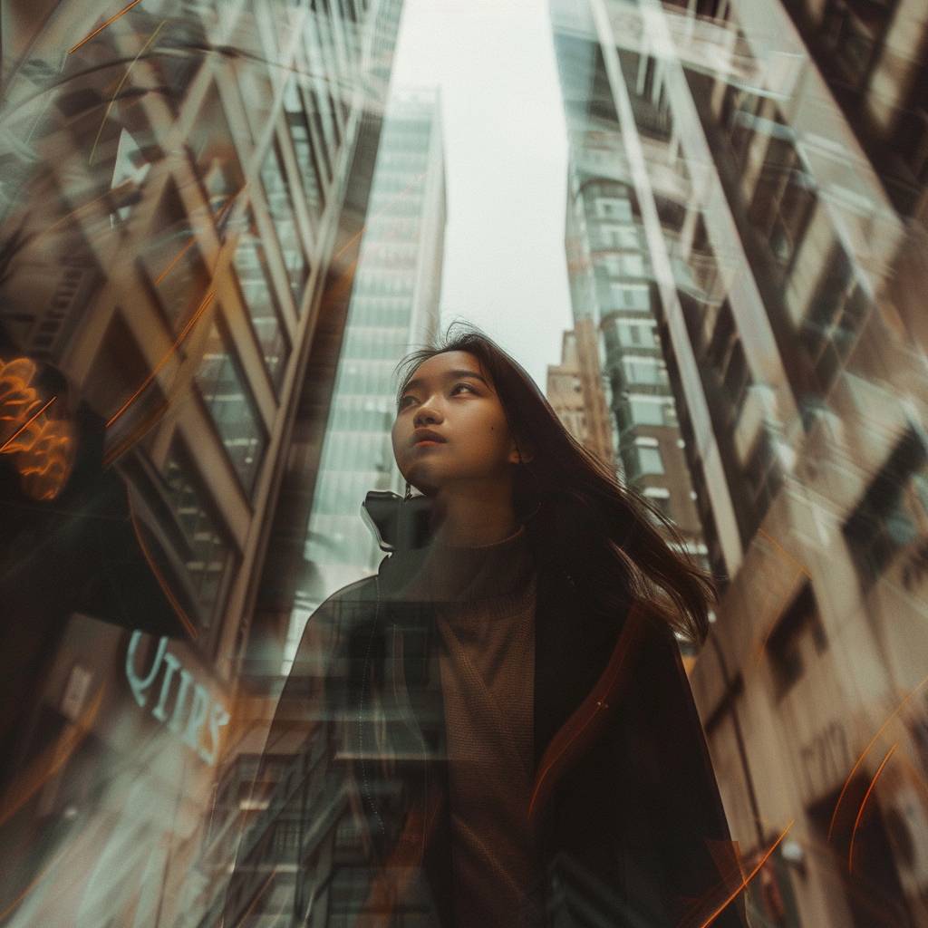 배경에 건물이 있는 젊은 여성, 디지털 사진 스타일의 거리 사진, 주위에 왜곡이 있는 전신 사진.