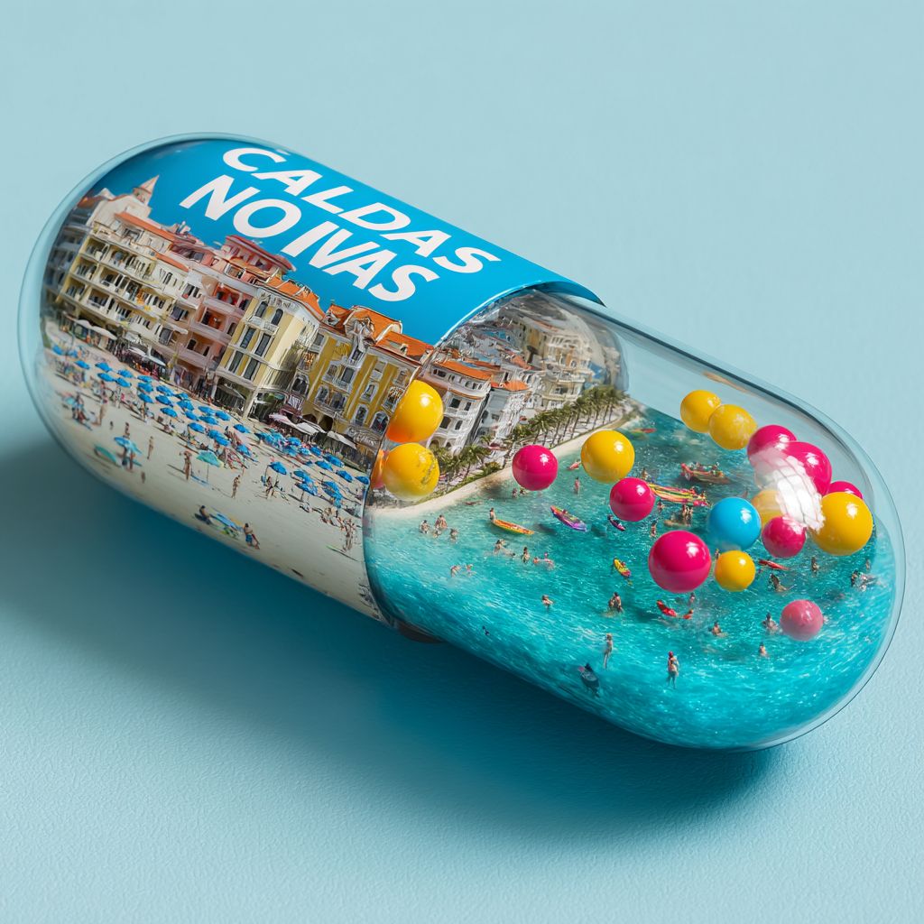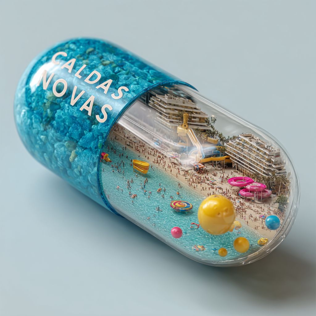 3:2 비율의 이미지를 생성합니다. 캡슐 모양의 미니어처 창의적인 장면으로, 캡슐은 수평으로 놓여 있습니다. 캡슐의 절반은 선명한 파란색으로, 그 위에 흰색 글씨로 'CALDAS NOVAS'가 인쇄되어 있습니다. 다른 절반은 투명하여 브라질 고이아스주 카르다스 노바스의 관광 도시의 실제 건축 특성을 담은 미니어처를 보여줍니다. 장면에는 온수 풀에서 사람들이 물놀이를 하거나 물미끄럼틀과 화려한 부표들이 있습니다. 전체 스타일은 3D로 렌더링되어 꿈 같은 느낌을 줍니다. C4D로 제작되었으며, 재료는 광택이 나는 외관을 가지고 있습니다.