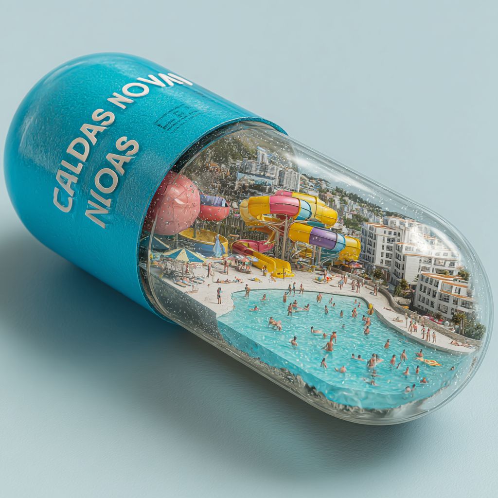 Generate a 3:2 scale image, a miniature creative scene in the shape of a capsule, with the capsule placed horizontally. Half of the capsule is in vibrant blue, printed with the white words "CALDAS NOVAS". The other half is transparent, showing a miniature of the real architectural characteristics of the tourist city of Caldas Novas in Goiás Brazil - scenes of people in the hot water pools, water slides and colored buoys. The general style is rendered in 3D, giving a dreamy feeling. It is made with C4D and the materials have a shiny appearance --v 7.0 --s 250