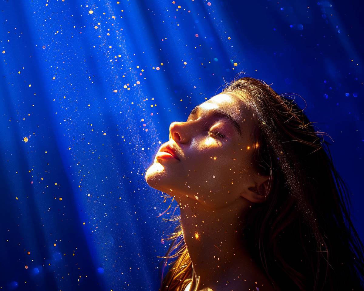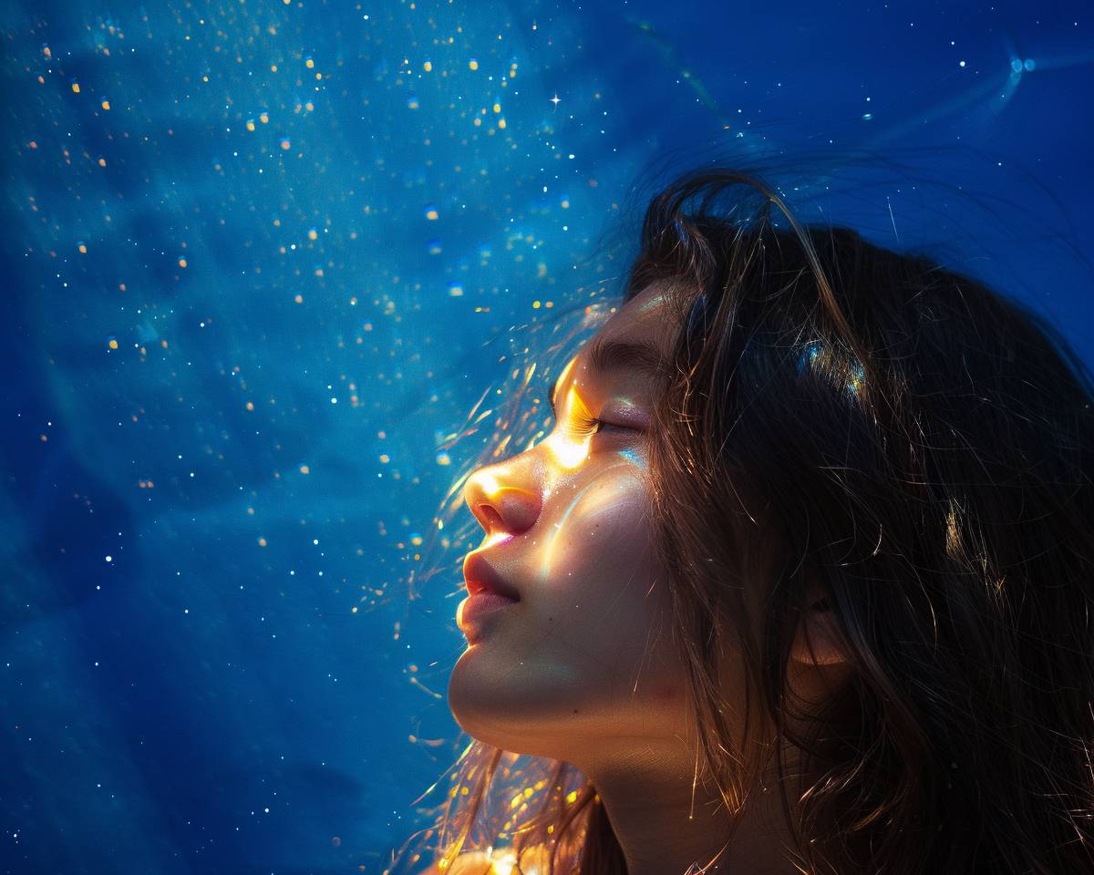여름에 태닝한 긴 머리의 소녀의 고대비 사진, 햇살로 비추어진 그녀의 피부, 깊은 파란색 배경은 별들로 가득한 무한한 공간을 나타냅니다.